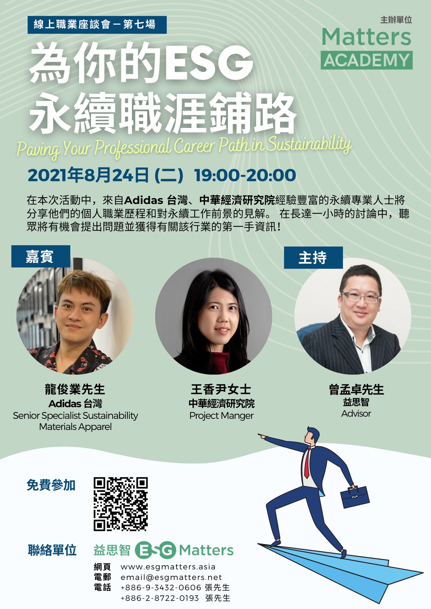 企業永續是一個新興的行業,受到越來越多人的關注。但是,不少人普遍認為進入這個領域,均需建立或具備相應的ESG能力。如果想要入行,到底需要怎樣裝備自己呢?在本次活動中,我們有幸邀請到來自Adidas臺灣、中華經濟研究院經驗豐富的永續專業人士將分享他們的個人職業歷程和對永續工作前景的見解。 在長達一小時的討論中,聽眾將有機會提出問題並獲得有關該行業的第一手資訊,萬勿錯過!