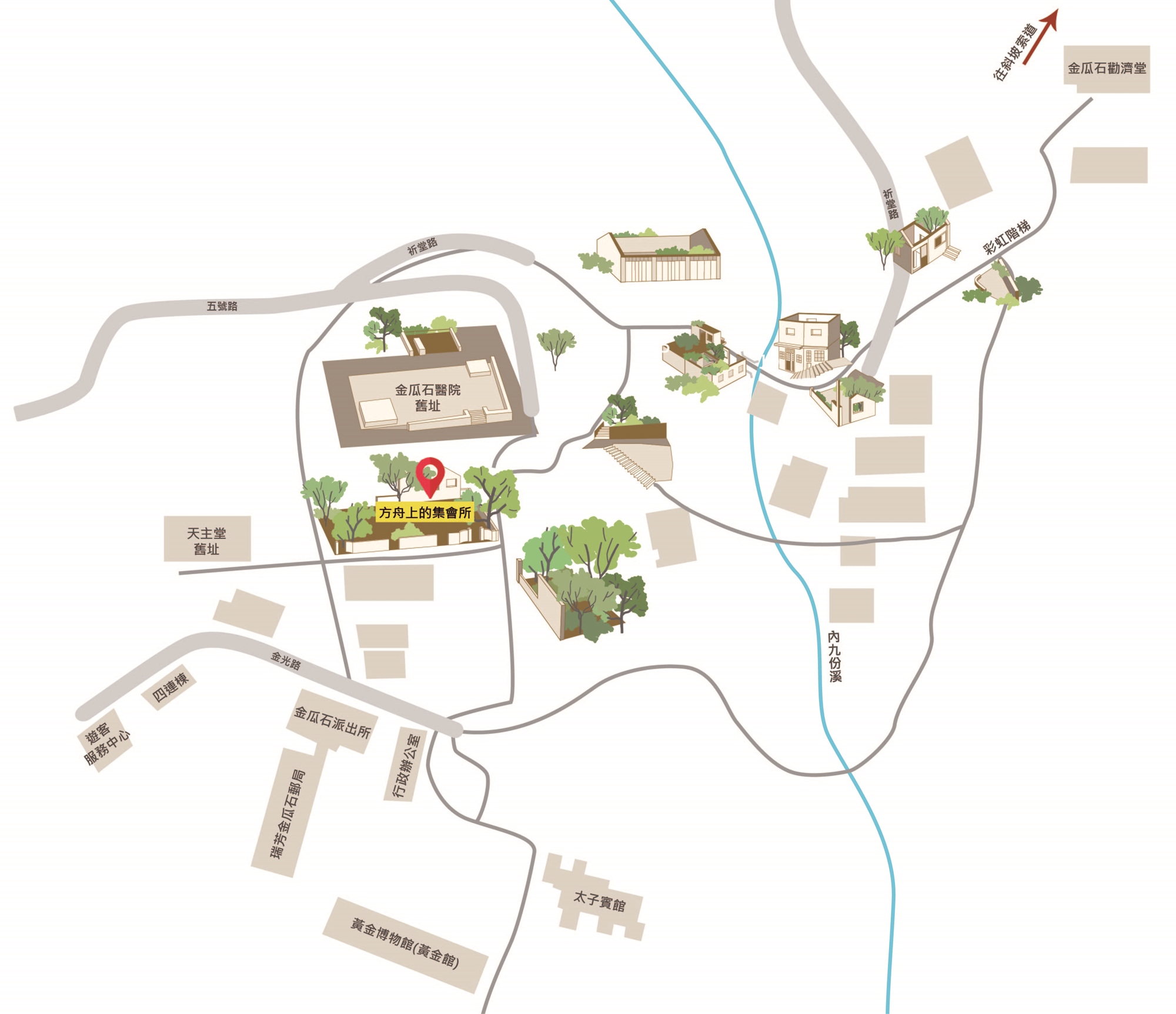 到達黃金博物館「遊客服務中心」後往「行政辦公室」方向前進,從「行政辦公室」旁往祈堂聚落之階梯朝「金瓜石醫院舊址」方向步行約1分鐘即可抵達。