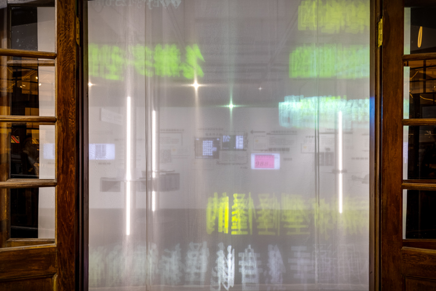 A:展區入口的紗材質半透明投影布幕就像螢幕畫面,觀眾透過掃QRcode可以輸入文字,化為彈幕呈現在畫面上,是展場蠻有互動性的特點。這道「螢幕畫面」後的第二層次是展區中央像光柱的展桌,面對鏡子會看到一道一道光柱形成的街廊,透過鏡面連結虛實空間。再往後就是標本牆,標本牆呼應入口即時投影彈幕的薄紗,文字是橫向的,營造處於一個大量資訊快速流動空間的感受。