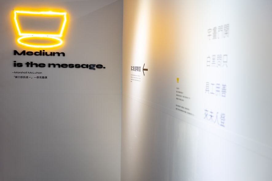 第二區造字實驗室「媒介即訊息」,其實字體是一種溝通的媒介,因為文字是大家心目中一個抽象的存在,只有寫出來才是具體的形象。我們在使用文字溝通的時候看到的都是字體,字體是影響每一個人對一段文字觀感非常重要的中介點。「媒介即訊息」這句話背後的主張並不是內容不重要,而是你要注意到媒介本身帶給你的影響,完全不亞於內容訊息本身帶給你的影響。用這句話來開始造字實驗室意思是當你了解字體的構成——為什麼一個字看起來嚴肅、為什麼一個字看起來可愛,你會更了解怎樣運用這個媒介。
