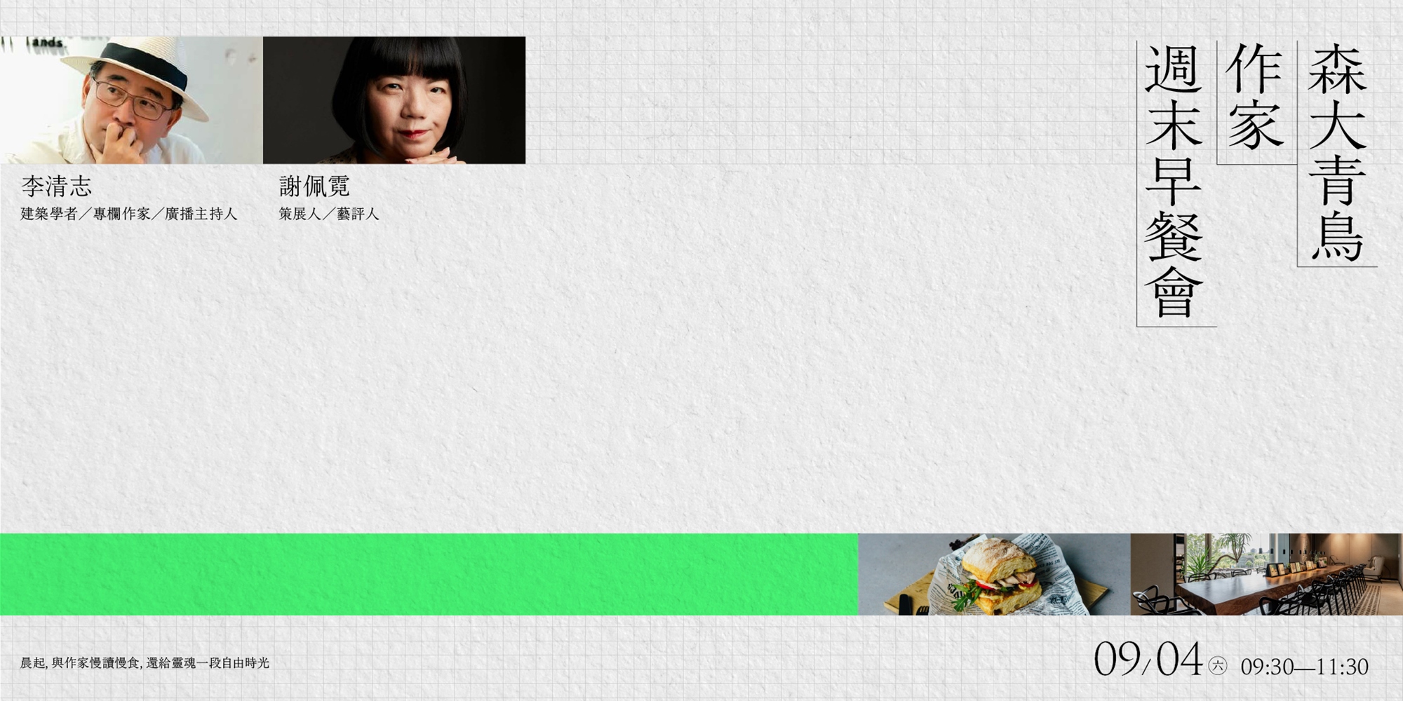 首場作家週末早餐會,邀請到兩位專精不同領域的文化作家:李清志、謝佩霓,同場輪番分享針對建築與藝術之細膩視角,著作統整觀點,但人生歷練所累積的底蘊仍存於作家們現場分享中,於燦燦晨光、暖盛朝食,與讀者們共享一場美好的早晨聚會。