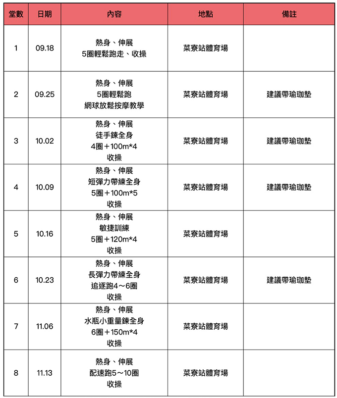 *跑步約佔每堂1/3,肌力體能訓練亦約佔1/3,伸展熱身、收操則共約佔每堂1/3
