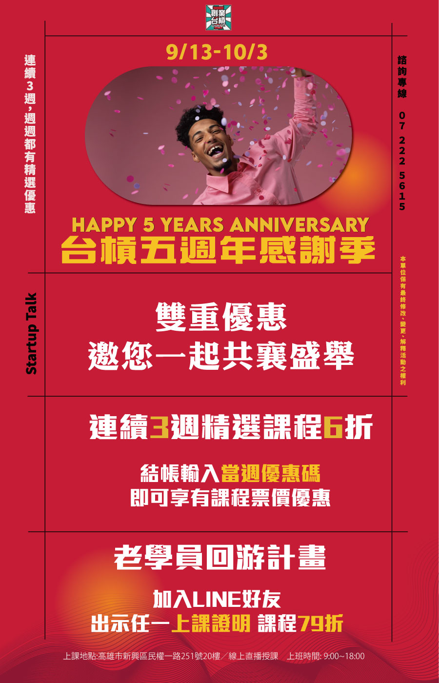 - 課程諮詢:週一~週五09:00-18:00請洽:07-2225615 創業台槓
