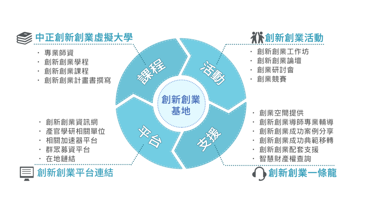 - 整合產官學研與創投基金力量,提供課程訓練、活動參與、空間提供,專業產學輔導,國際合作機會及創業資金引介等服務,並成立「中正育成公司」,協助培育的優秀團隊創業,滿足創新創業多樣化的需求。