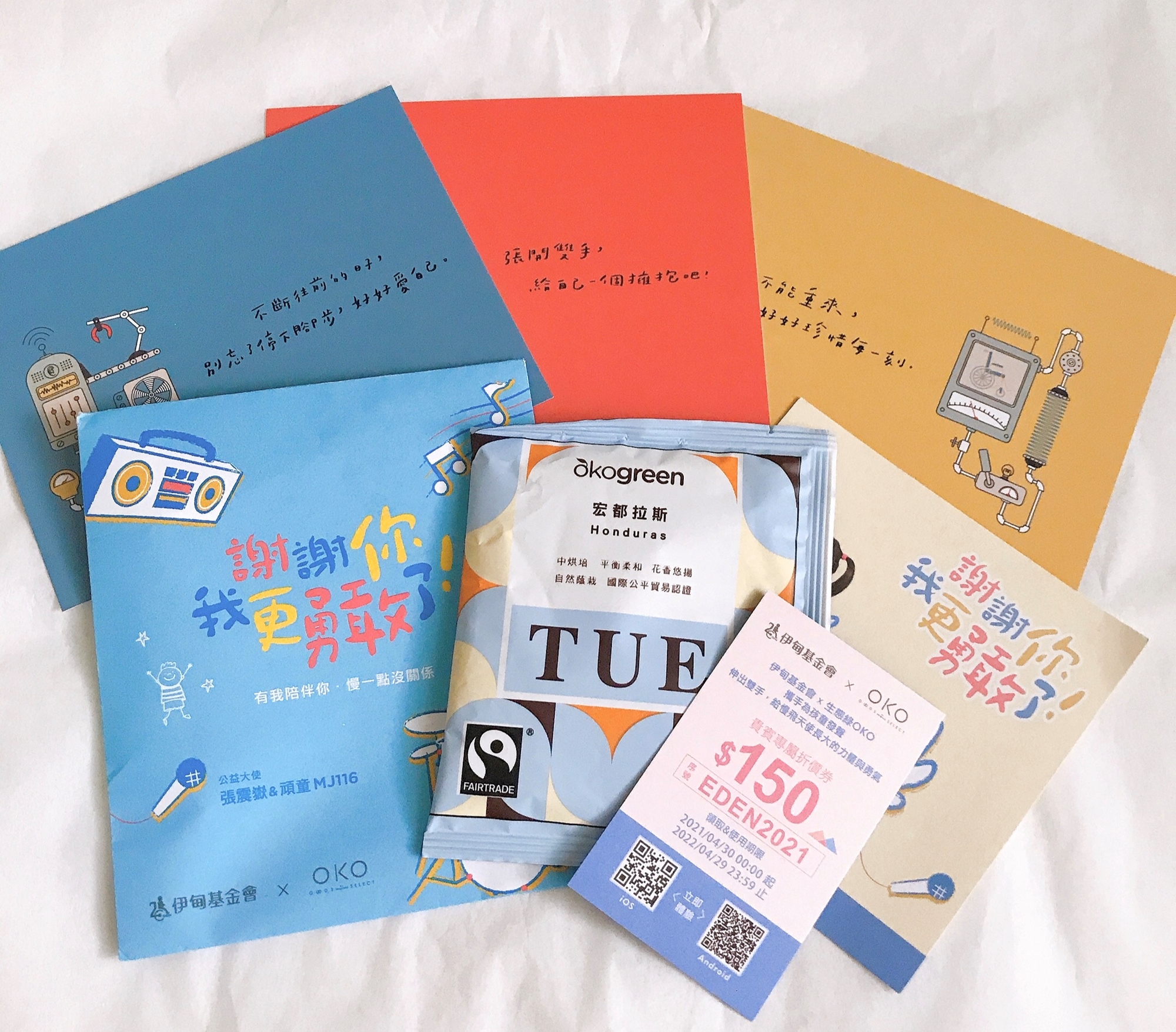 內含無障礙生活節明信片*3+慢飛天使感謝小卡*1+生態綠折價券$150元+濾掛咖啡包*1或南非國寶茶*2(口味隨機出貨,恕不挑選)
