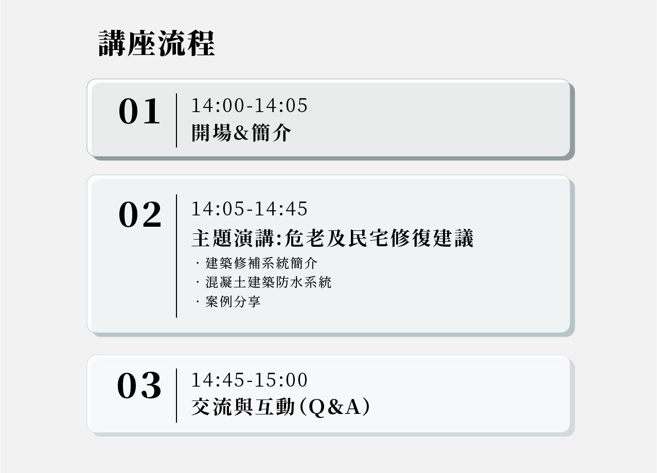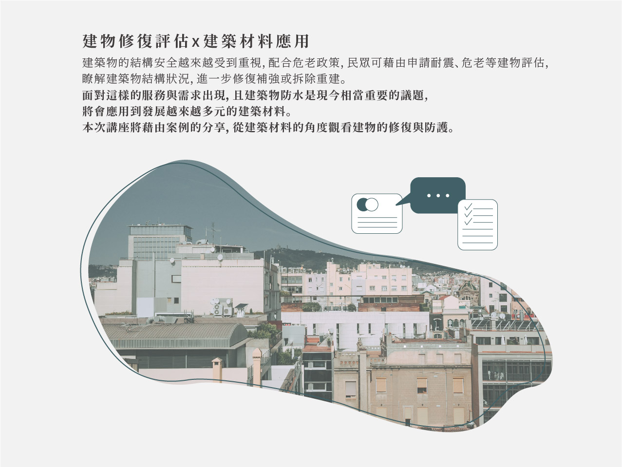 建築物的結構安全越來越受到重視,配合危老政策,民眾可藉由申請耐震、危老等建物評估,瞭解建築物結構狀況,進一步修復補強或拆除重建。 面對這樣的服務與需求出現,且建築物防水是現今相當重要的議題, 將會應用到發展越來越多元的建築材料。 本次講座將藉由案例的分享,從建築材料的角度觀看建物的修復與防護。