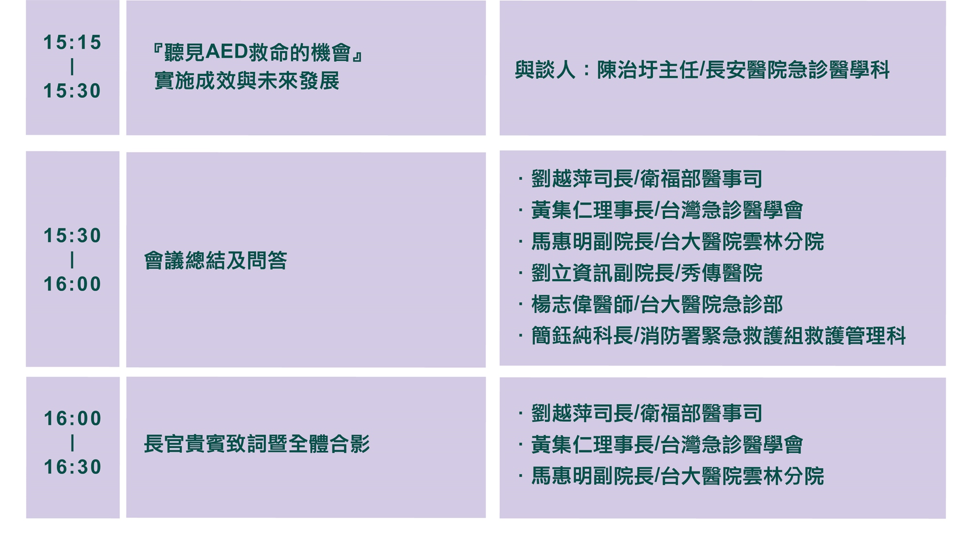 台灣急診醫學會在衛生福利部的指導下賡續辦理, 公眾 AED ( Public-Access Defibrillation)之政策推動與研討(本次活動稱之 PAD 管理暨創新應用論壇),將邀產、官、學、醫、研各界、國際專家學者及倡議團體進行交流與經驗分享。