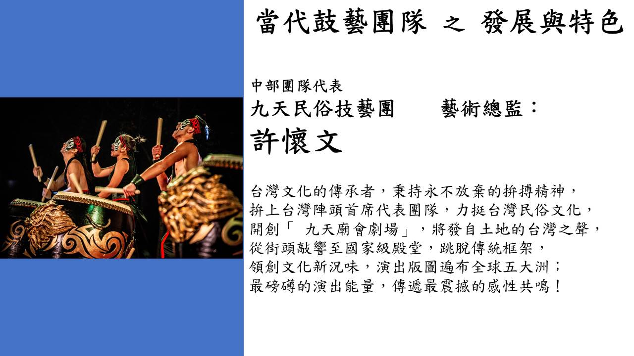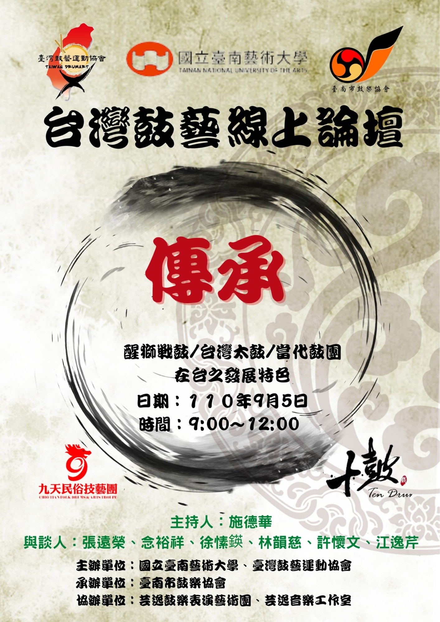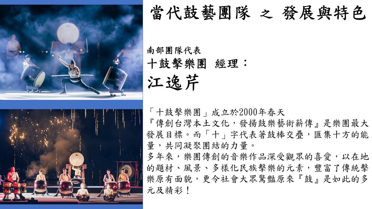 10:50~11:40 | 當代鼓藝團隊之 發展與特色 | 論壇主持人:施德華 中部團隊代表:九天藝術總監許懷文 南部團隊代表:十鼓擊樂團 經理江逸芹 |