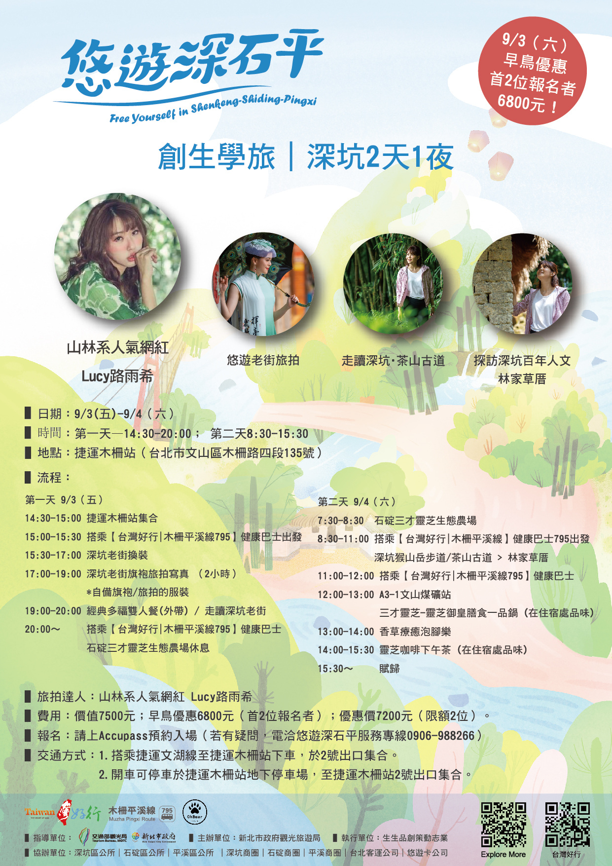 由山林系人氣網紅—Lucy路雨希現身引領,於深坑老街進行旗袍旅拍寫真。現場安排專業攝影師,為參與深坑老街旗袍旅拍的參與者留下美拍照片,傍晚再外帶百年傳奇豆腐料理。第二天早上走讀深坑茶山古道,探訪百年古厝—林家草厝,品味靈芝咖啡下午茶與體驗香草療癒泡腳樂。