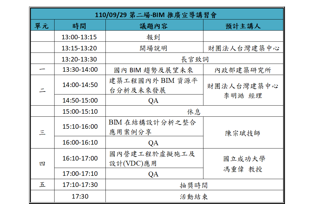 本次講習會透過建研所累積豐碩成果展示及業界BIM的應用經驗分享,讓大眾了解目前政府單位推動BIM的趨勢方向與決心,更希望透過營建產業中不同領域、不同系統的結合應用經驗分享,重新定義目前BIM的發展方向,激發國內AEC產業在BIM技術應用合作發展,讓國內建築相關產業除了能朝BIM前進,加以帶動國內營建產業技術應用自動化,加深應用層面的專業深度。