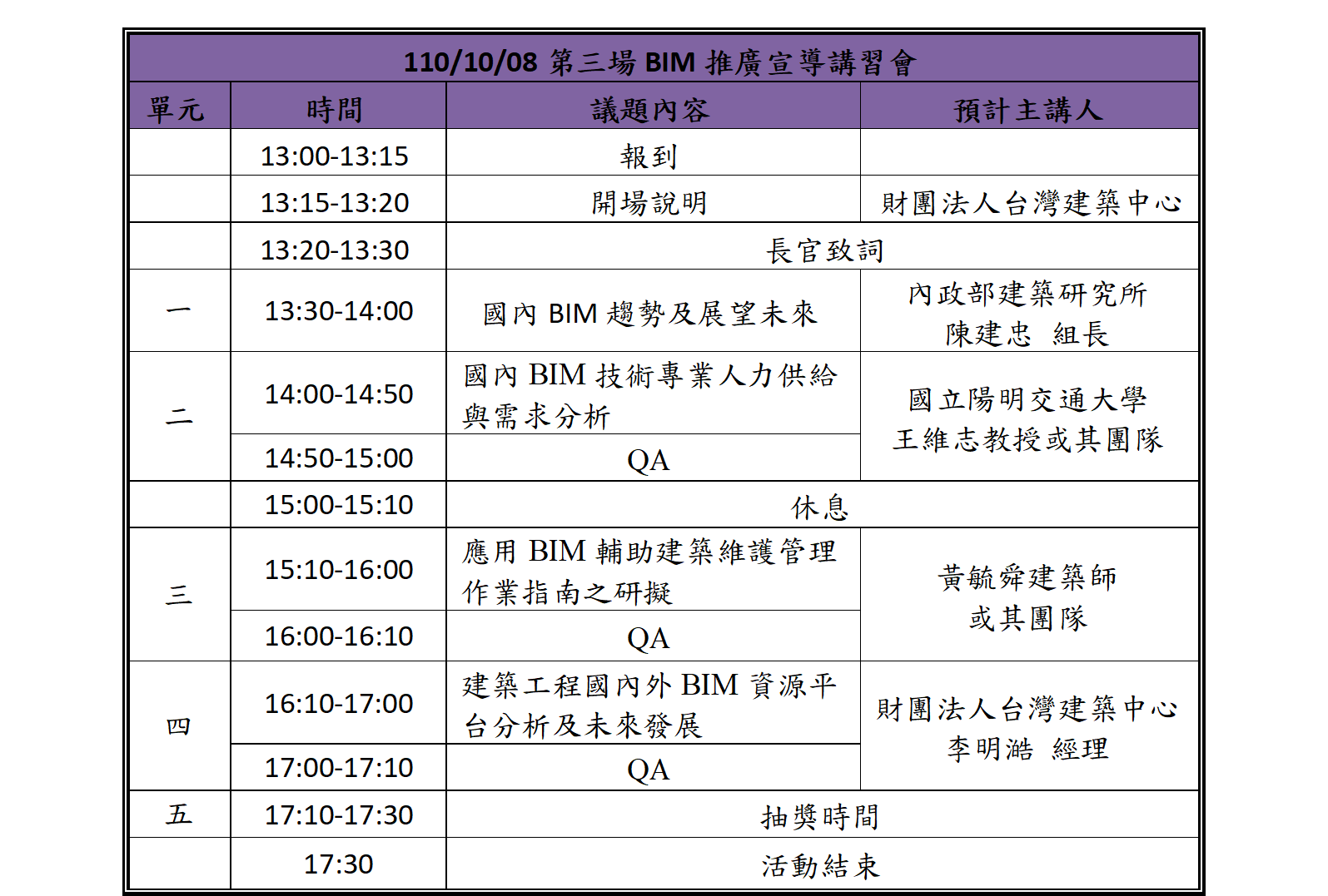 本次講習會透過建研所累積豐碩成果展示及業界BIM的應用經驗分享,讓大眾了解目前政府單位推動BIM的趨勢方向與決心,更希望透過營建產業中不同領域、不同系統的結合應用經驗分享,重新定義目前BIM的發展方向,激發國內AEC產業在BIM技術應用合作發展,讓國內建築相關產業除了能朝BIM前進,加以帶動國內營建產業技術應用自動化,加深應用層面的專業深度。