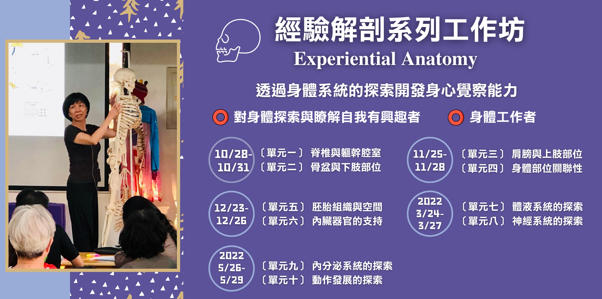 目前本會開設十單元的經驗解剖工作坊,每年規劃在二個學期進行,預定於各月底週末連續四天開課,可 [ 全期 ] 或 [ 單獨報名單元 ] 分別參加。