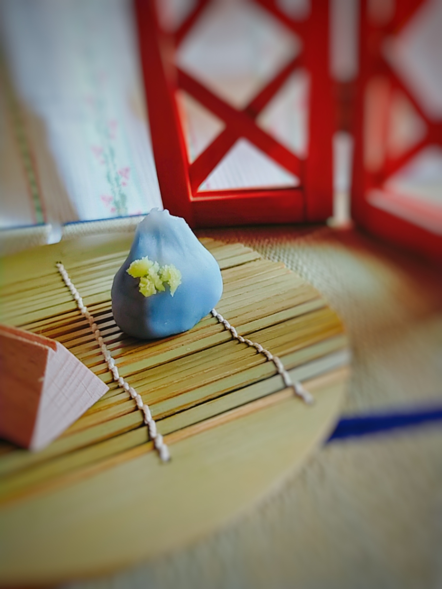 上生果子成分:白豆沙(白鳳豆、蔗糖、麥芽糖、海藻糖、玉米糖膠)、白玉、焙茶粉、梔子花天然食用色素、水