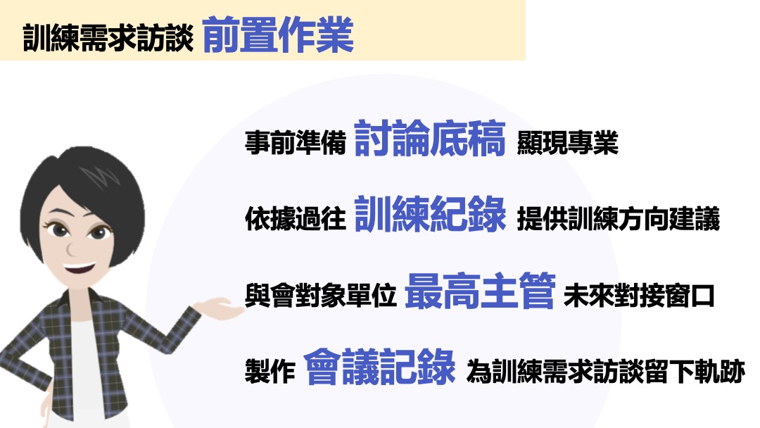 2. 學習如何運用「訪談法」,減少與需求單位的認知落差,提高其訓練滿意度。 |