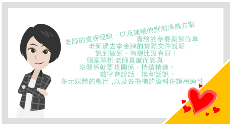 資訊科技業/人資專員: 課程非常豐富,也有滿滿的簡報實務案例分享,提供許多想挑戰國家獎項的秘訣,提高成功率,謝謝老師! |