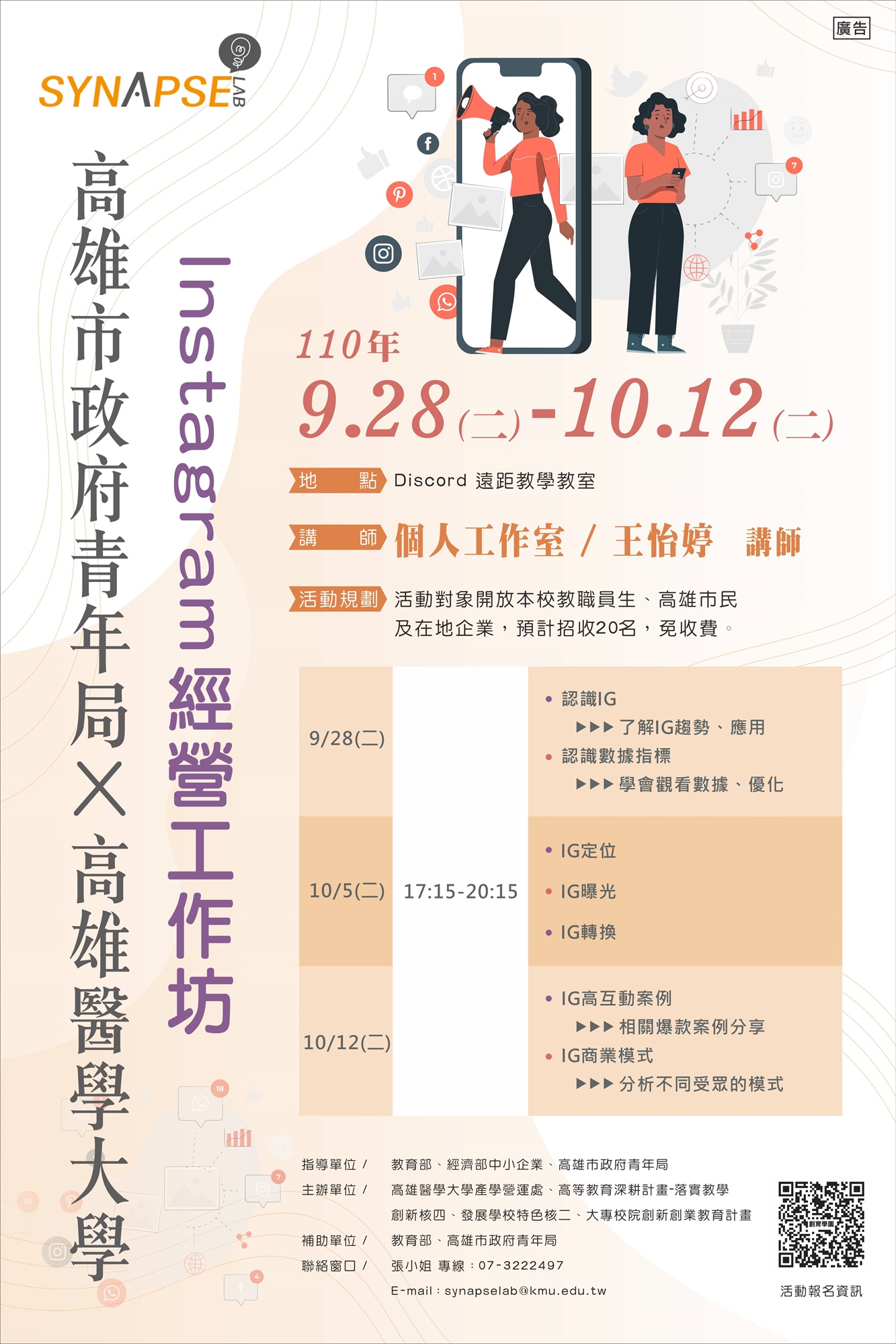 【聯絡窗口】張小姐 專線:07-3222497|單位信箱:synapselab@kmu.edu.tw