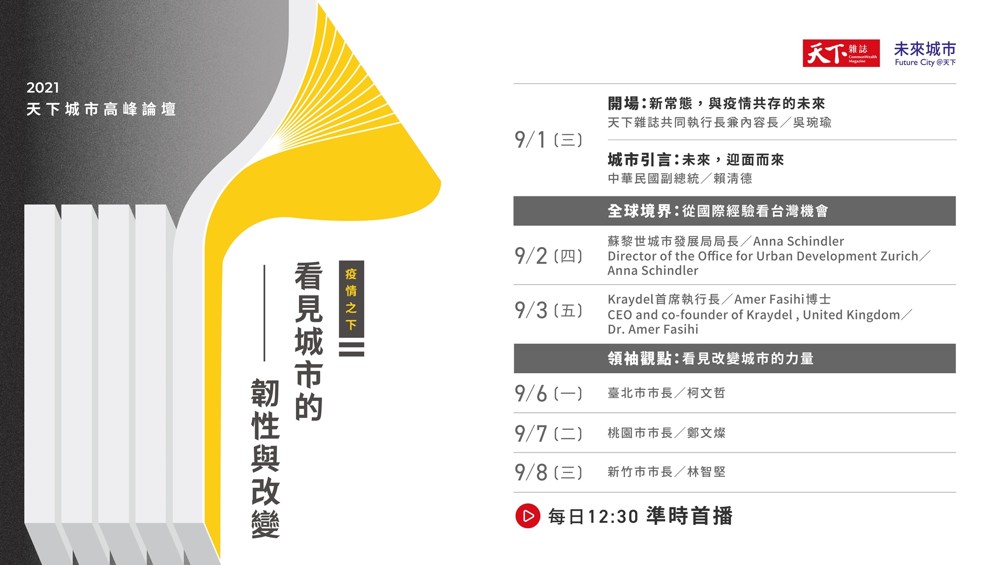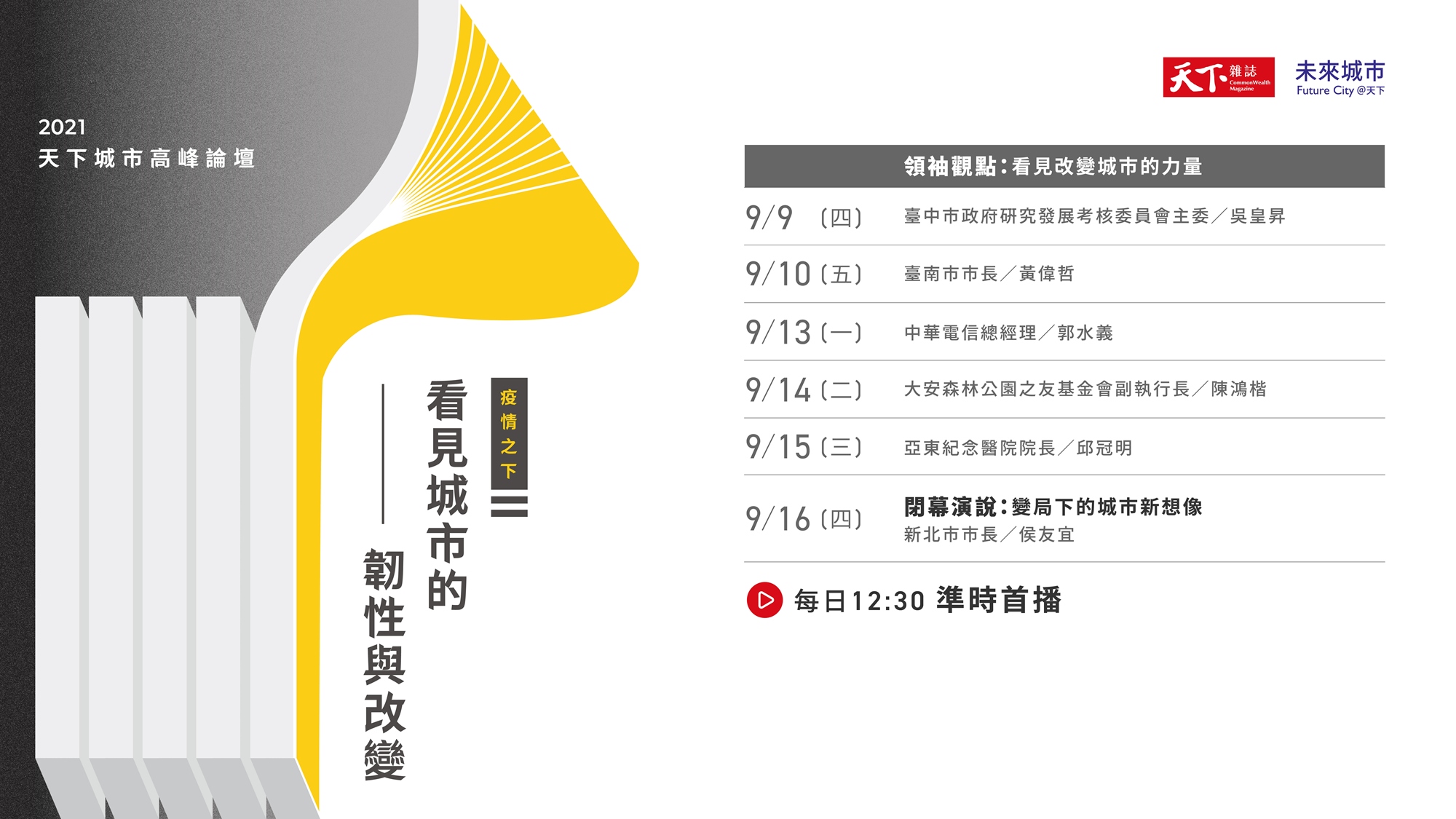 為此,天下雜誌及未來城市頻道將於9/1-9/17舉辦「2021天下城市高峰線上論壇」,期望透過邀請國家、城市與企業典範,在此關鍵時刻,以具體的行動揭竿改變。