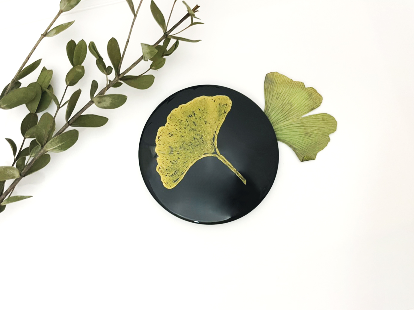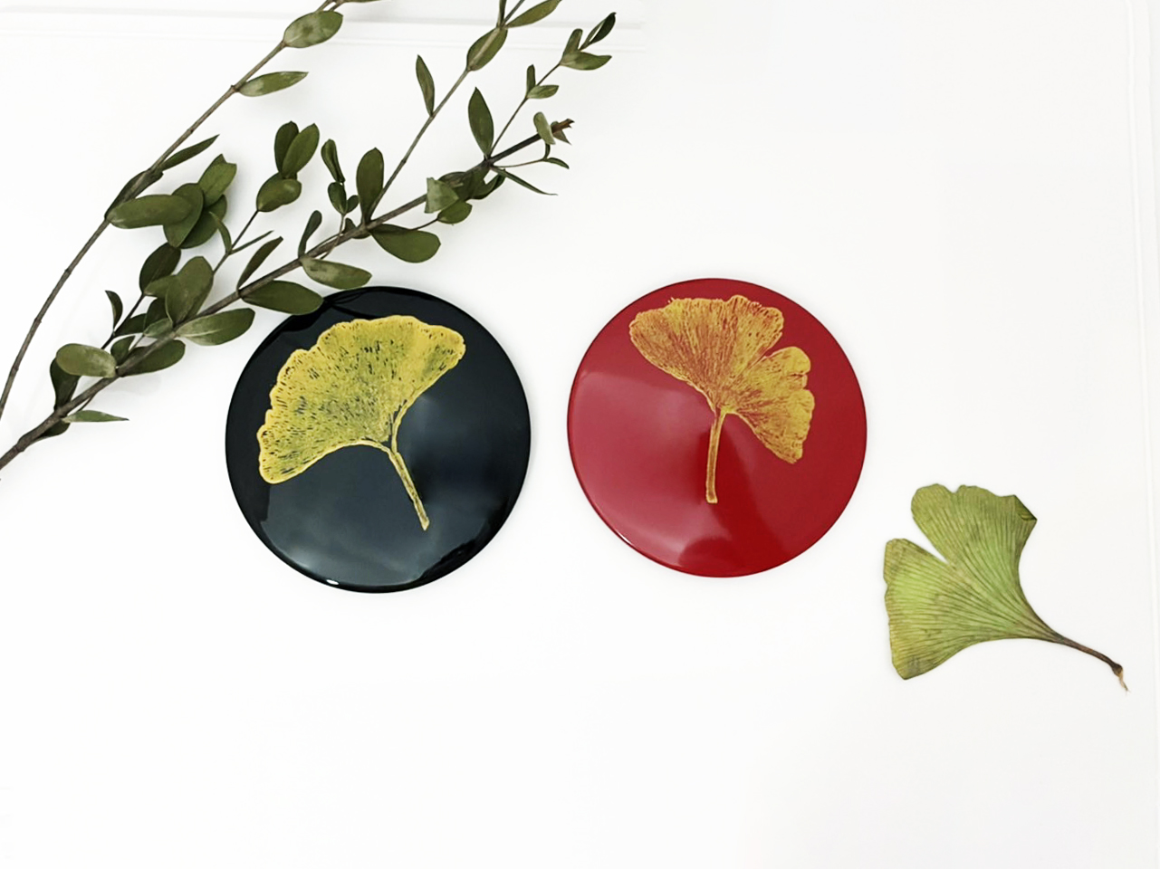 將銀杏葉用樹漆拓印至木胎漆器上