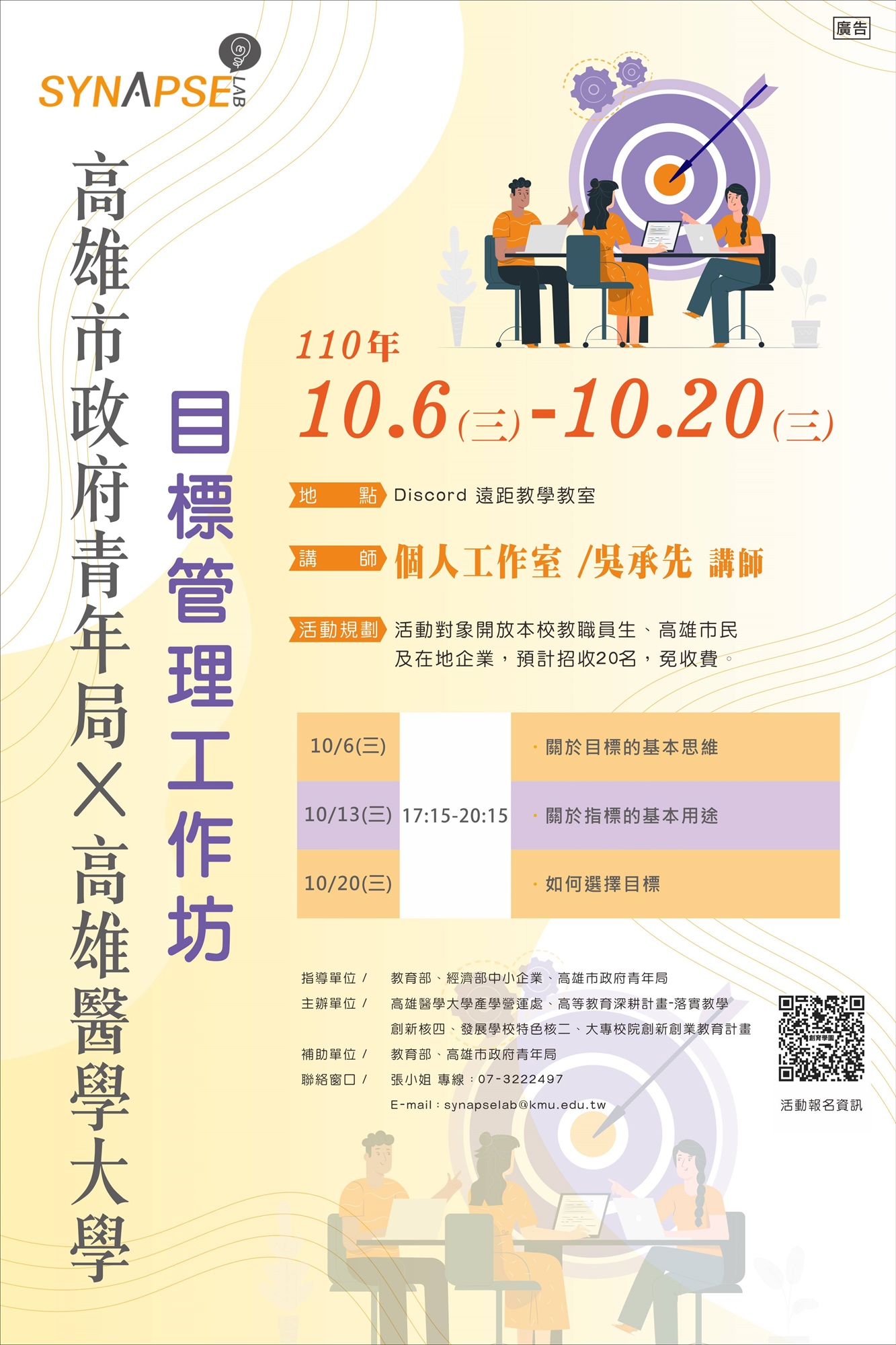 【聯絡窗口】張小姐 專線:07-3222497|單位信箱:synapselab@kmu.edu.tw