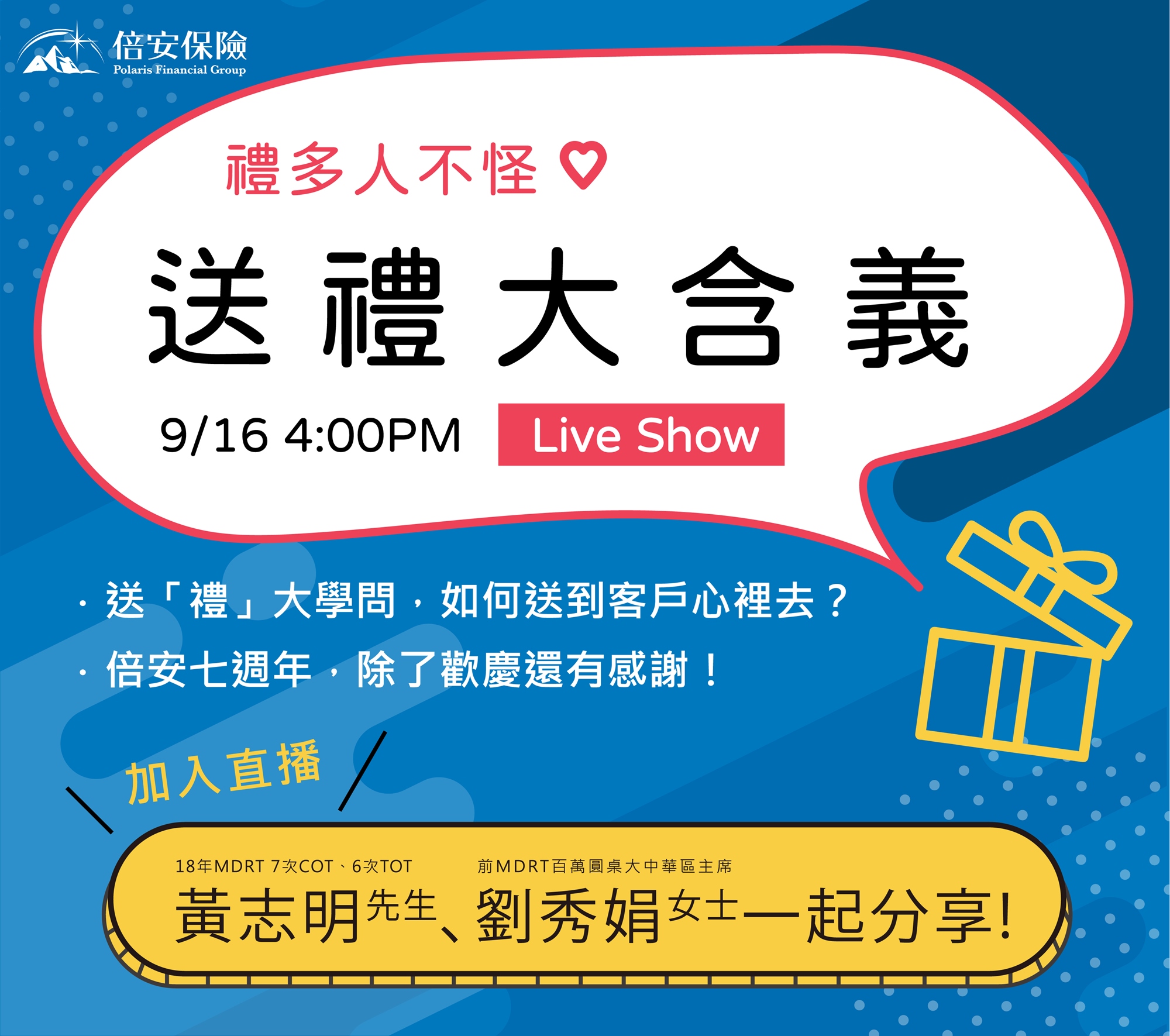 ☞一起來聽聽倍安保險執行長與總經理,同時也是 「18年MDRT百萬圓桌會員(7次COT、6次TOT) 黃志明先生」與「前MDRT大中華區主席 劉秀娟女士」的送禮心法!