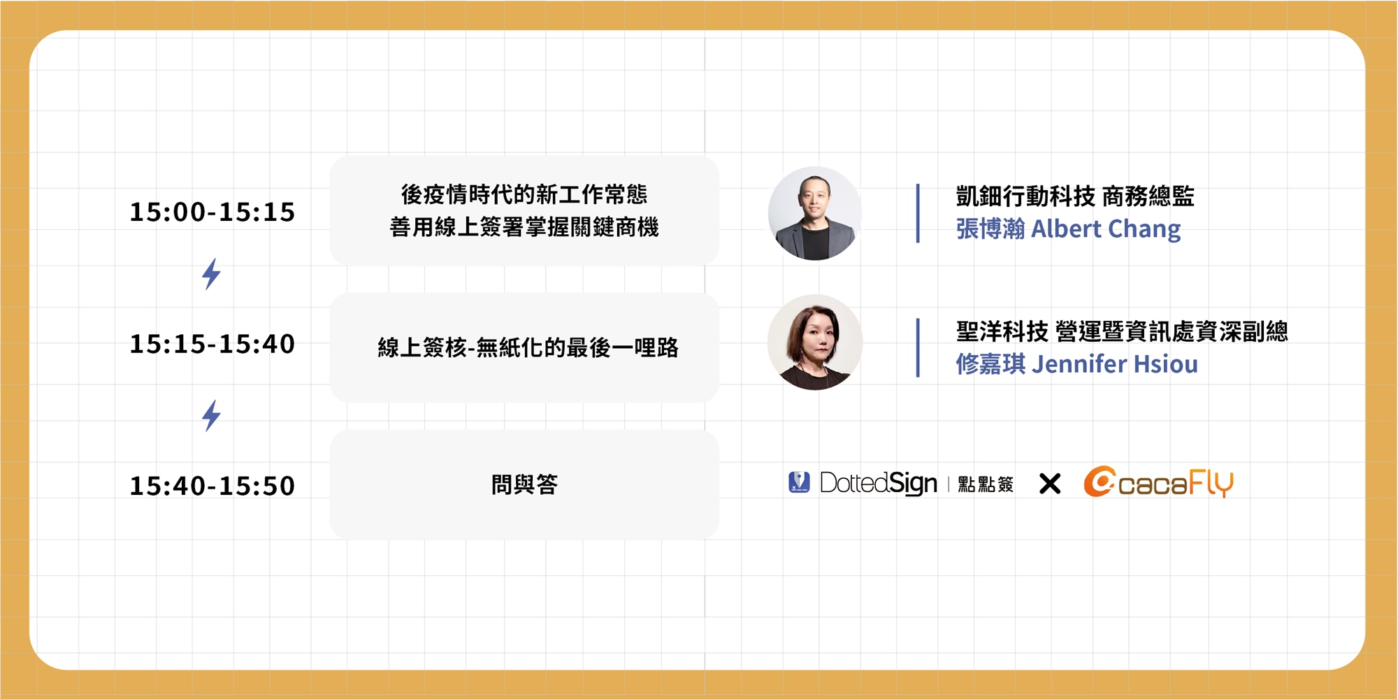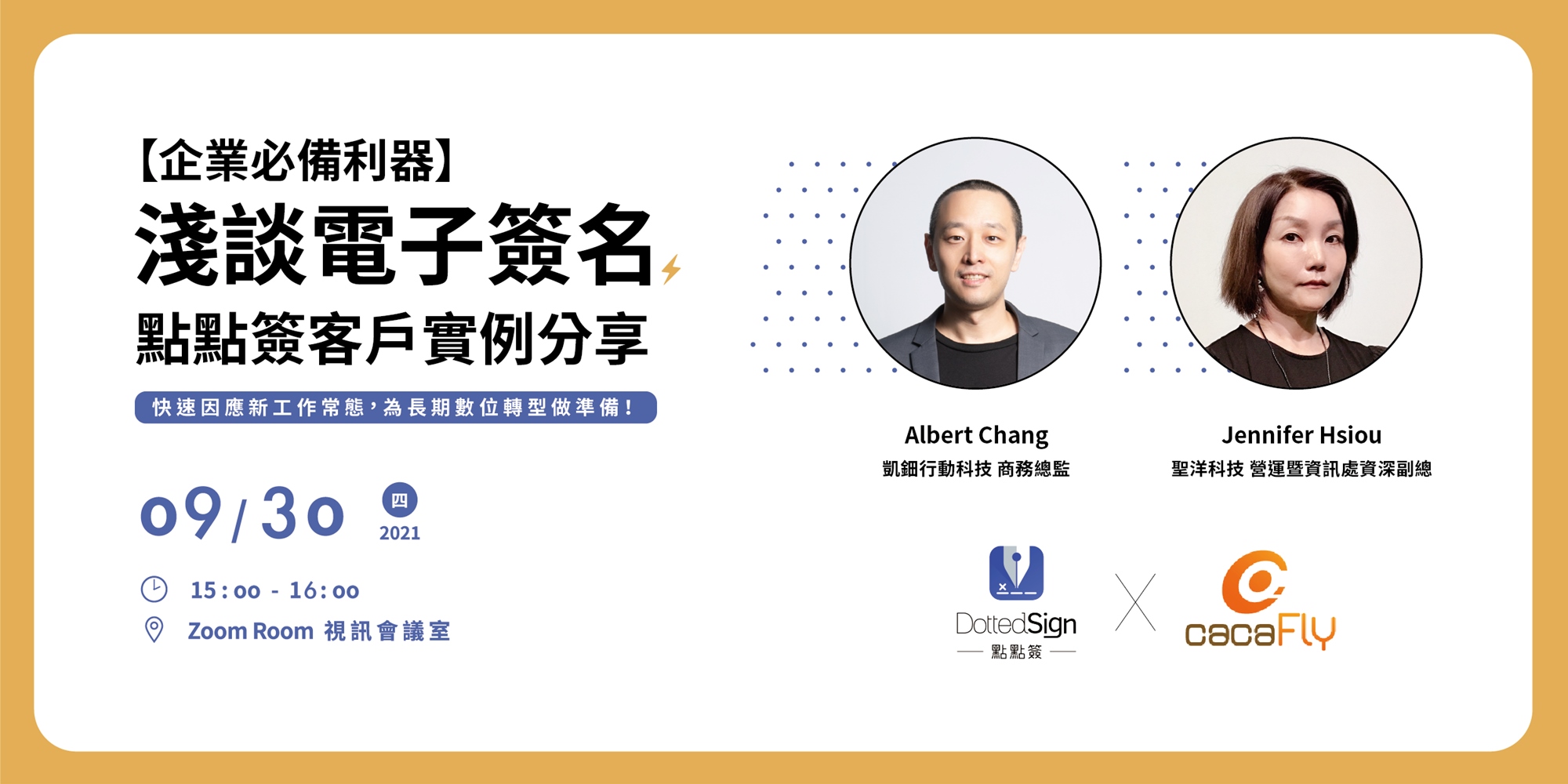此場線上分享會我們邀請台灣社群行銷的領導品牌「聖洋科技cacaFly」,與我們聊聊以往傳統紙本簽署遇到的挑戰,以及導入點點簽後的轉變及心得。藉由這場分享會,我們希望幫助與會來賓更加認識電子簽名,不僅是為因應疫情新工作常態,更是往成熟的企業數位轉型更邁向一步。