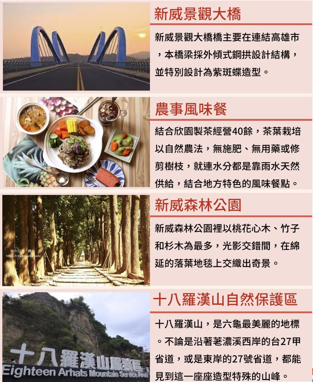 Day 2 早餐(09:00) > 六⻱農夫體驗(10:00) > 農事風味餐(11:30) > 十八羅漢山自然保護區(13:30) > 新威森林公 園(15:00) > 賦歸(15:30) (旗山轉運站)
