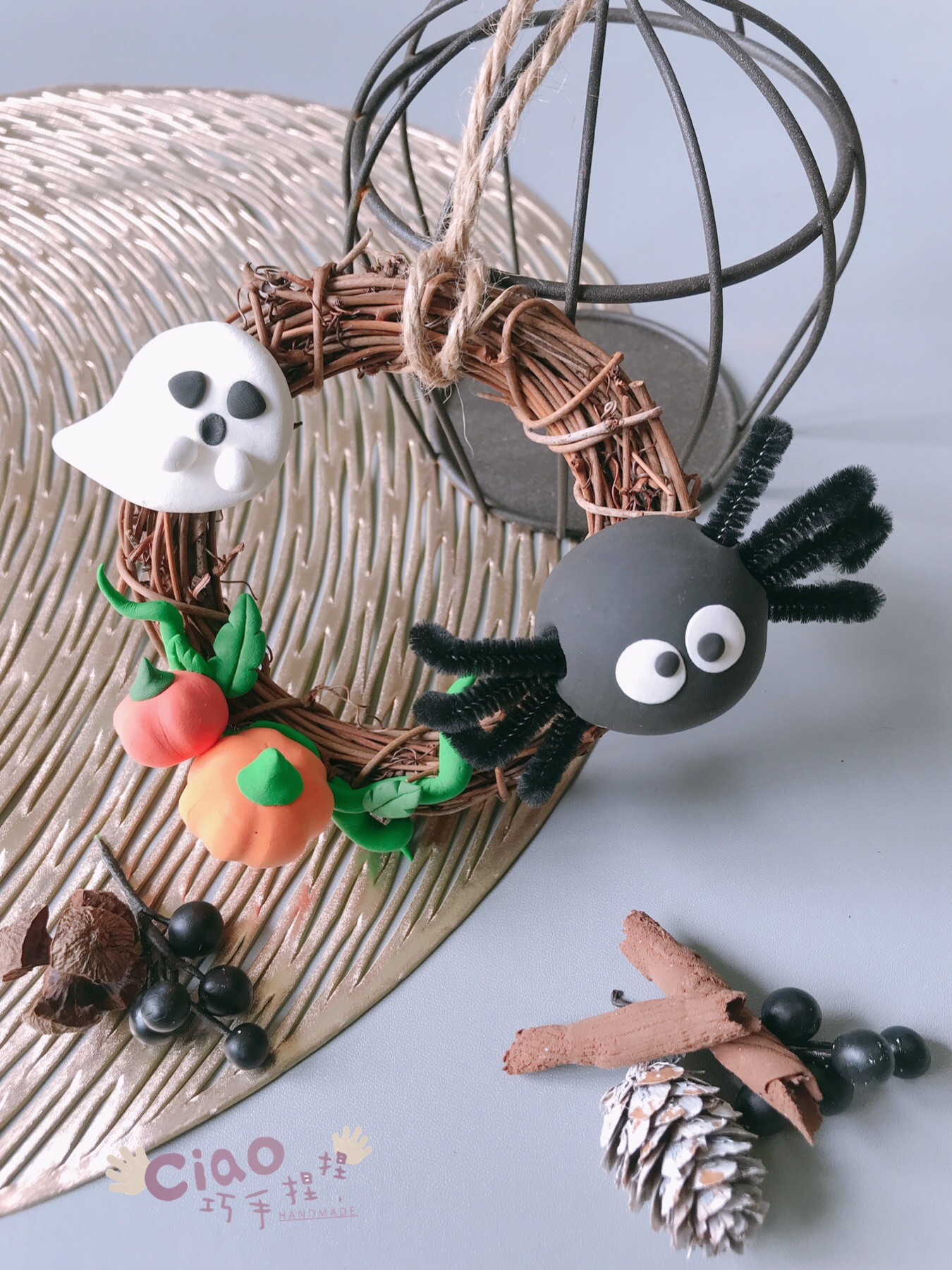 運用毛根製作大蜘蛛加上俏皮幽靈和南瓜集結的花圈,