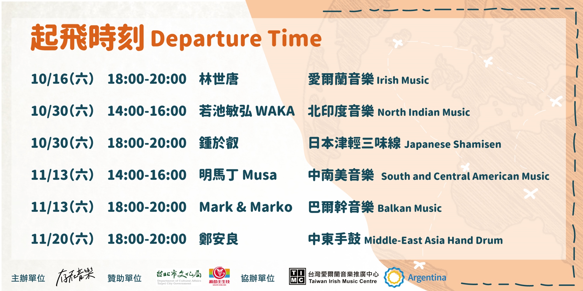 從充滿歡樂氣息的愛爾蘭音樂、到濃厚傳統風味的日本三味線,一次體驗兩種印度特殊樂器𝐄𝐬𝐫𝐚𝐣、𝐓𝐚𝐛𝐥𝐚,兩位幽默風趣的巴爾幹半島樂手組合,也邀請到曾入圍金曲獎的阿根廷樂手Musa帶領大家玩遍中南美洲的多種特殊節奏" On Rhythm! ",以及世界手鼓大師鄭安良帶大家一起體驗中東手鼓,最超值的世界音樂系列講座,千萬不能錯過!