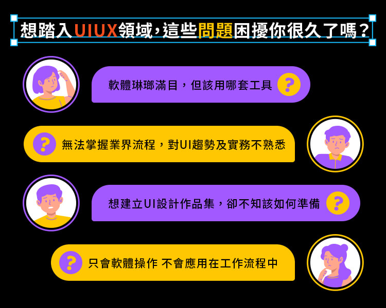 這門課程,除了想從事UI工作的學員之外,也歡迎工作中有需要與UI設計師合作的學員學習。本課程可幫助同學了解Figma在團隊合作中的功用,並經由認識設計師工作流程,讓溝通更加順暢有效率!
