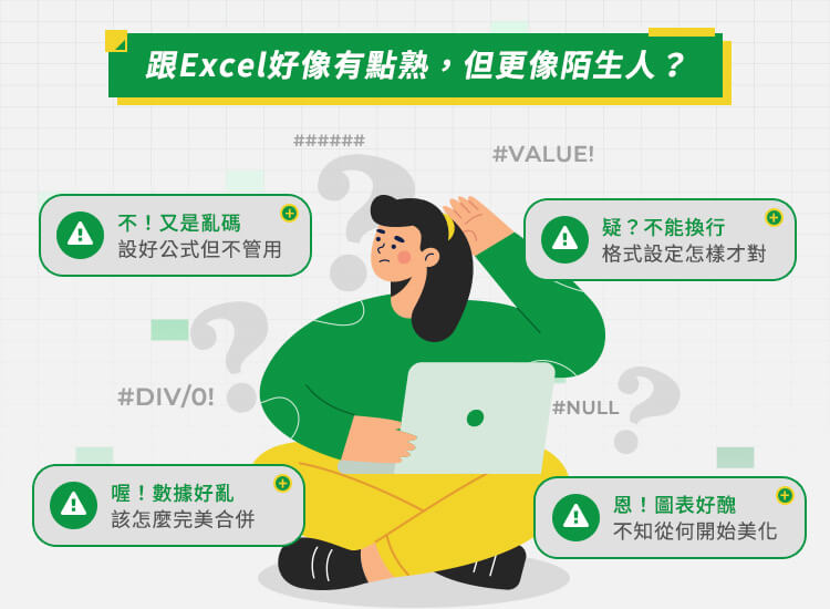 你跟Excel的關係,也是有點熟,但不太了解,覺得它是神秘黑洞。常常有令人崩潰的卡關,為什麼公式明明寫好了,但數字出不來,最討厭看到亂碼:#DIV/0!、#NULL!。每天面對數字報表,總是花好長的時間整理。