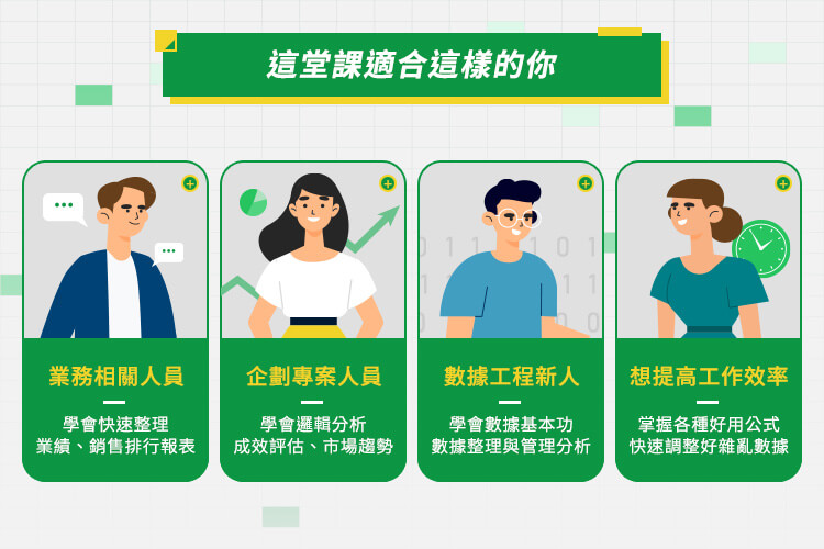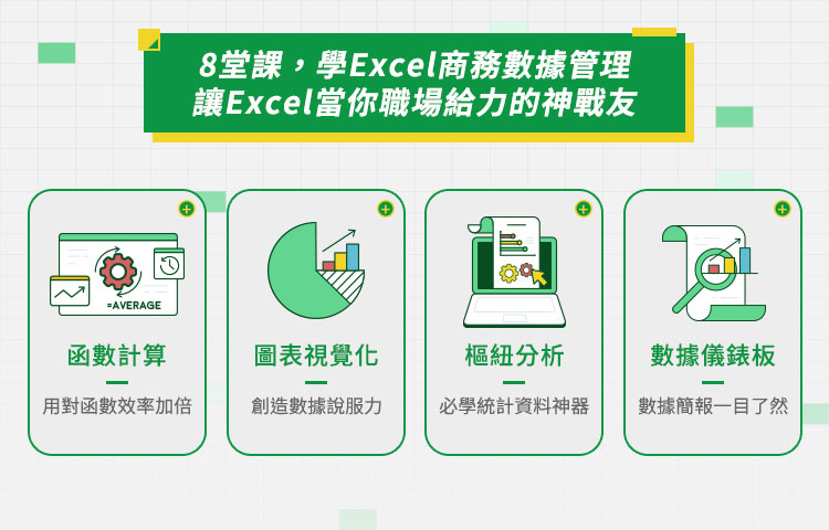 一次把Excel好用的功能都學會,從初階認識到函數、資料管理、圖表設計,進階應用的樞紐分析與數據儀表板,所有商務需求將在這堂課一次滿足。