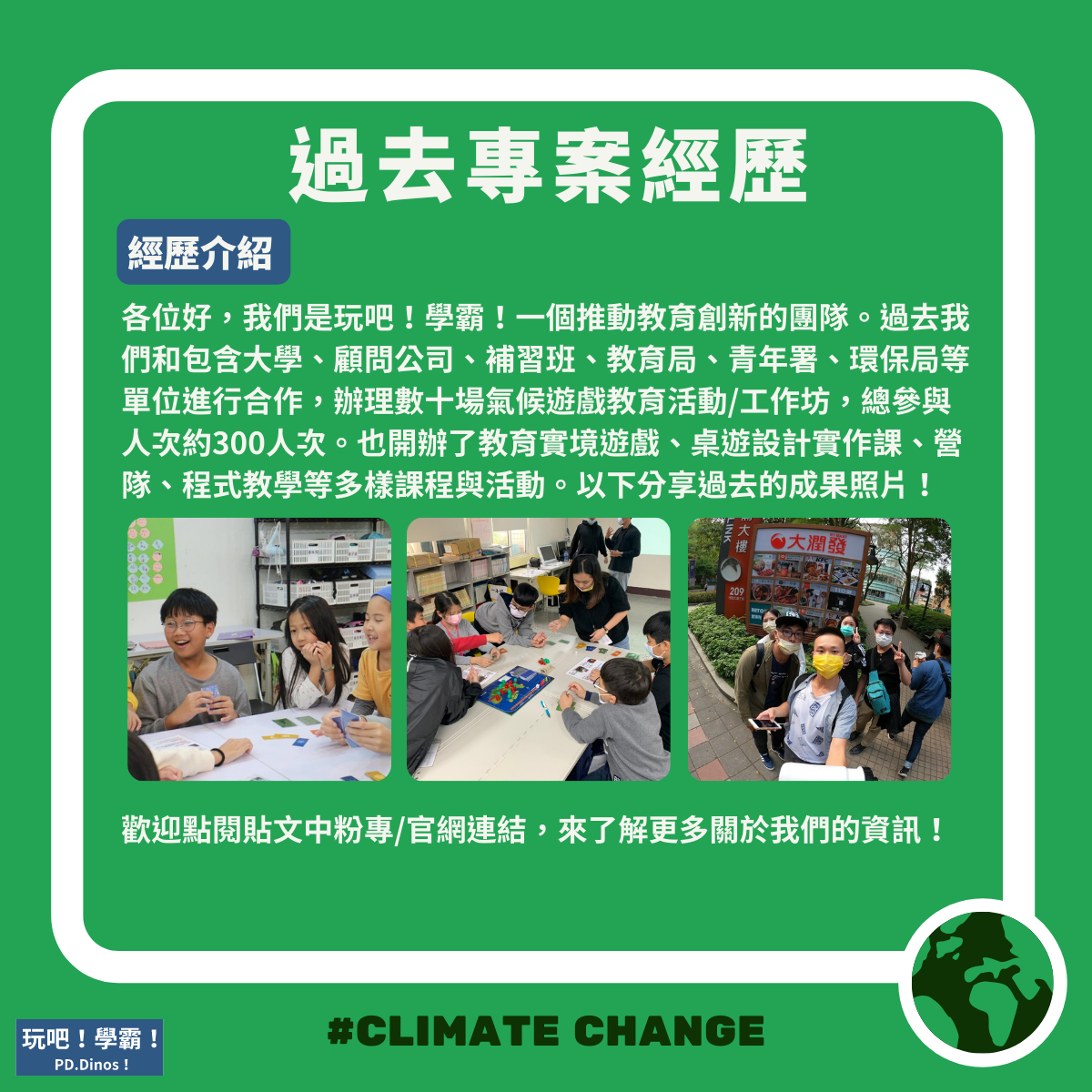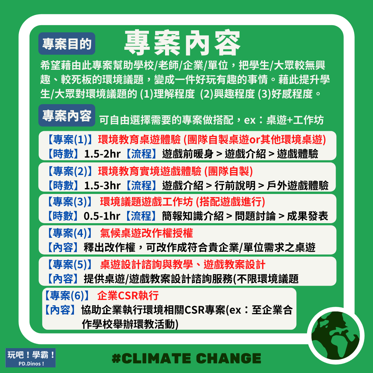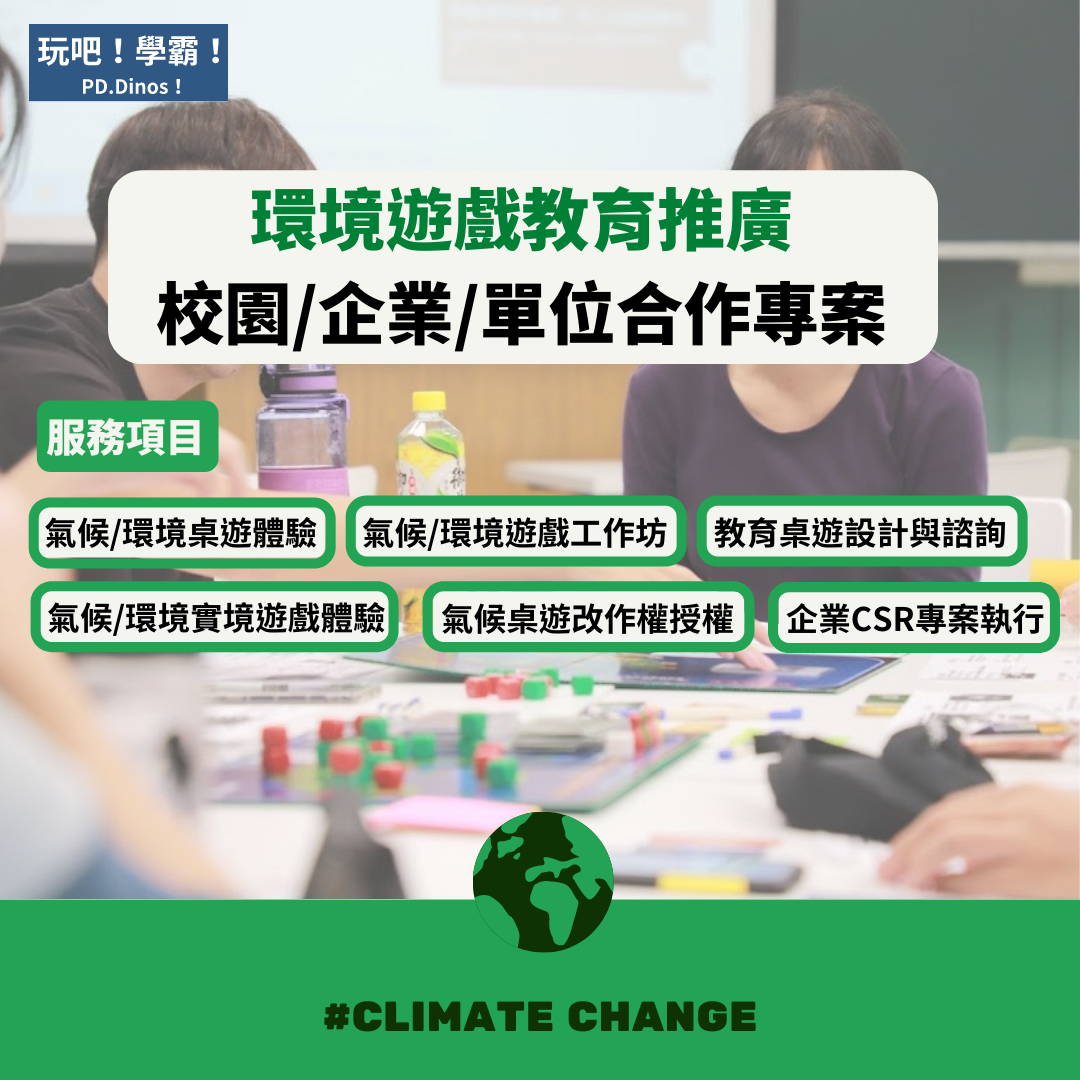 |提供氣候/環境桌遊體驗、氣候/環境實境遊戲體驗、環境議題遊戲工作坊、氣候桌遊改作權授權、桌遊設計諮詢與教學等課程/活動服務|