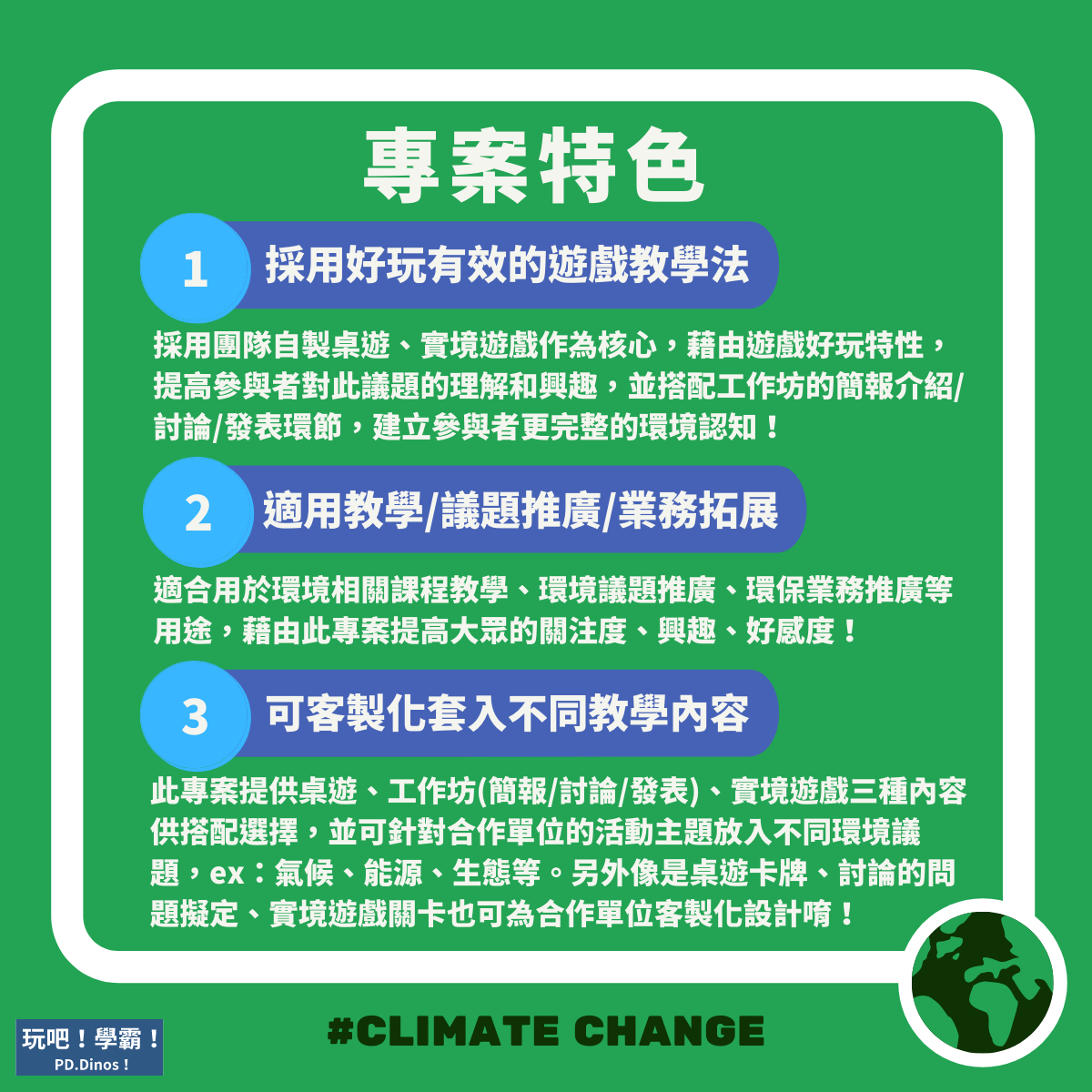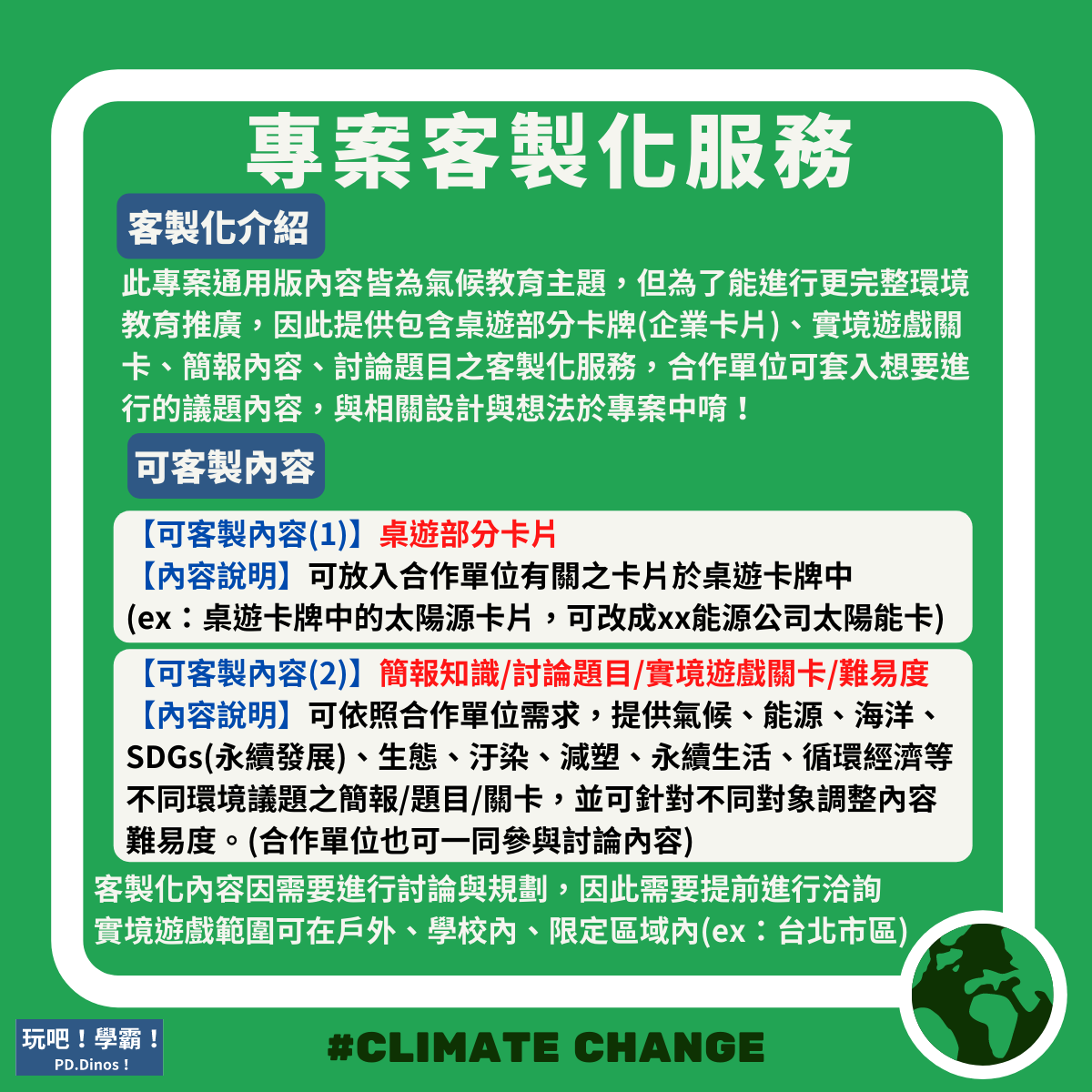 此專案通用版內容皆為氣候教育主題,另提供包含桌遊部分卡牌(企業卡片)、實境遊戲關卡、簡報內容、討論題目之客製化服務,合作單位可套入想要進行的議題內容,與相關設計與想法於專案中唷!