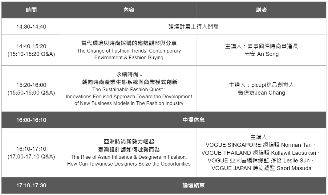 國際時尚論壇將由VOGUE 亞太區編輯總監 孫怡Leslie Sun擔任計畫主持人,薈萃亞洲時尚編輯與各界時尚領域精英人士,一探亞洲新勢力與消費者洞察,進行多方領域分享,零時差銜接最新時尚動脈,幫助有志從事設計時尚領域相關工作者,切合時代潮流發展、自由探索時尚找到自我優勢。