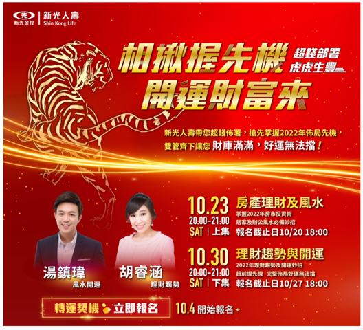 新光人壽隆重邀請到《錢線百分百》主持/製作人胡睿涵博士,以及《命運好好玩》、《風水!有關係》等命理節目專家湯鎮瑋老師,兩位專家將在講座中帶領各位把握未來先機找到適合你的投資方向及時機,除了讓你財庫滿滿之外,更讓你守住財運,讓你在新的一年運勢順著走,運用專家的智慧財富豐收好運無法擋!