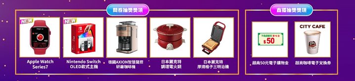 - 頭獎:Apple Watch Series7 (市價約12,000元)1名(依Apple台灣官網公告價399 USD,預計110年秋季末上市,實際定價將以該公司公告為主)。