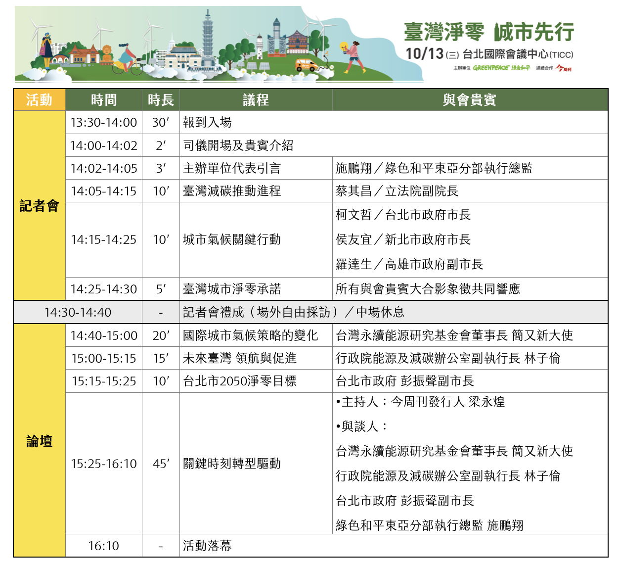 《綠色和平》與《今周刊》將於10月13日共同舉辦【臺灣城市淨零承諾】記者會 暨【臺灣淨零 城市先行】論壇,適逢聯合國國際減災日,期望透過此次論壇邀集臺灣中央與地方領袖,共同倡議臺灣城市氣候行動,促進城市交流、分享減碳經驗與未來目標,串連中央、地方政府採取更積極態度面向2050淨零碳排路徑。