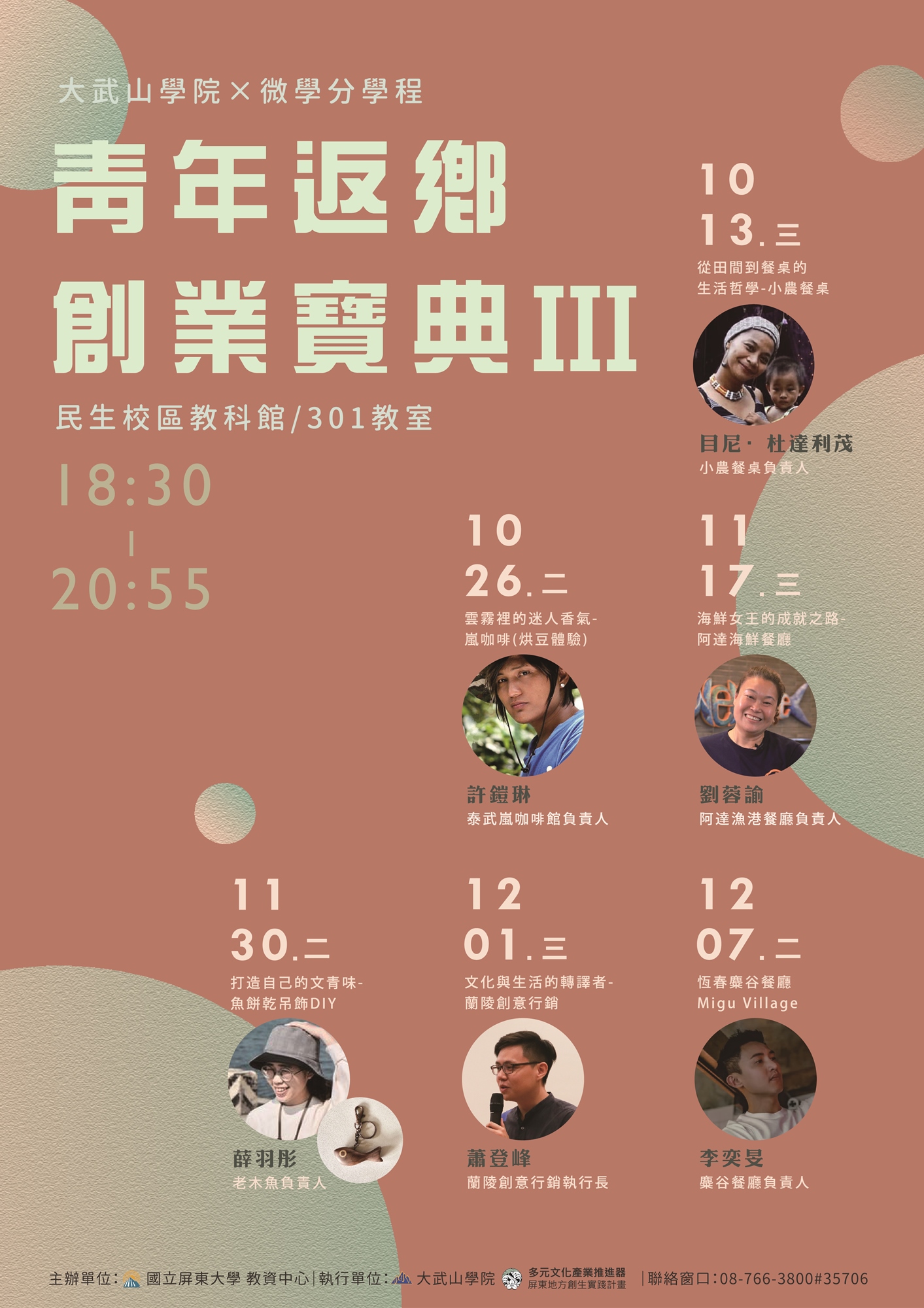 2019年為台灣地方創生元年,各鄉鎮都努力挖掘自己地方的特色產業來發展,但創業仍為一門需要深入學習的課題,所以我們邀請了屏東的創業青年,分享自己的創業歷程,以及他們如何用自己的方式協助鄉鎮發展,期望能讓學員從這些寶貴經驗中得到啟發。