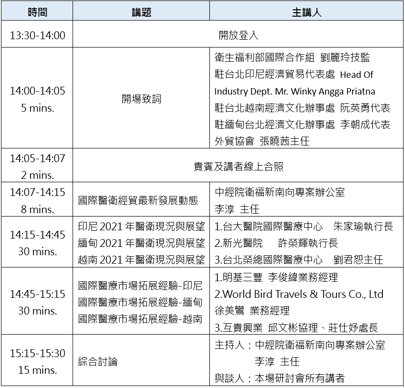 為落實醫衛新南向政策的產業鏈結,中經院衛福新南向專案辦公室特邀請台大醫院(主責國家為印尼)、新光醫院(主責國家為緬甸)及榮陽團隊(主責國家為越南)分別分享其主責國家的醫療現況和未來展望。中經院衛福新南辦也將針對國際醫衛經貿最新發展動態提供專業及詳盡分析,更邀請於東南亞深耕的廠商代表分享東南亞市場拓銷經驗,期盼能協助產業界進一步掌握新南向國家投資商機。
