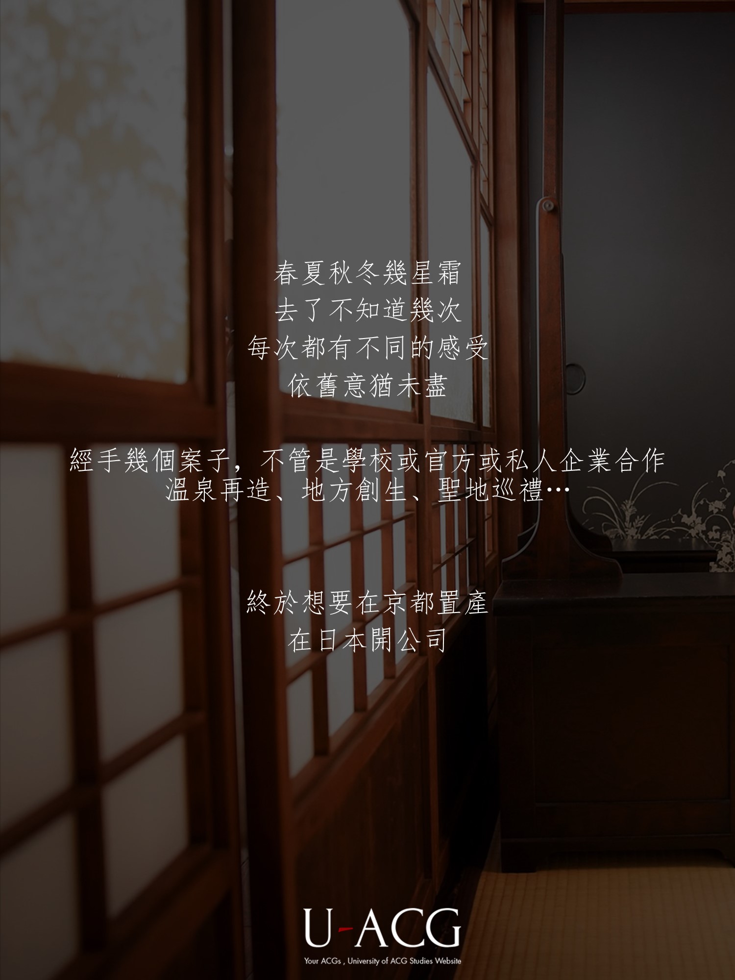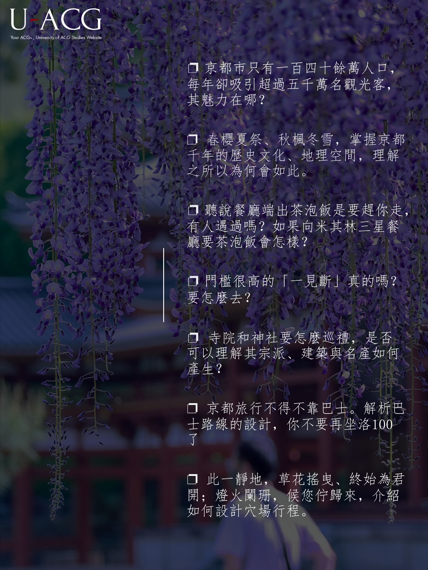 5. 關於京都房源之使用和機會,將在課程中說明。請特別注意:由於目前雙方國境受到疫情影響,尚未開放觀光名義入境,目前無法預測雙方開放之時間,且此並非贈獎活動,而是邀請您以友人身份與我們一起出行同遊,您必須自行負擔前往日本之相關費用和責任,且因為疫情或其他各種現實因素之變動,我們可能在未告知的情況下取消。我們期待您真心喜歡那種漫步在京都,清晨佇立於神社,靜夜徘徊於小徑,並與我們共同感受這份美好。