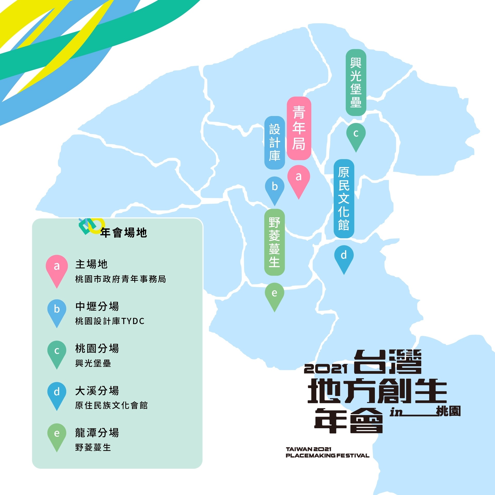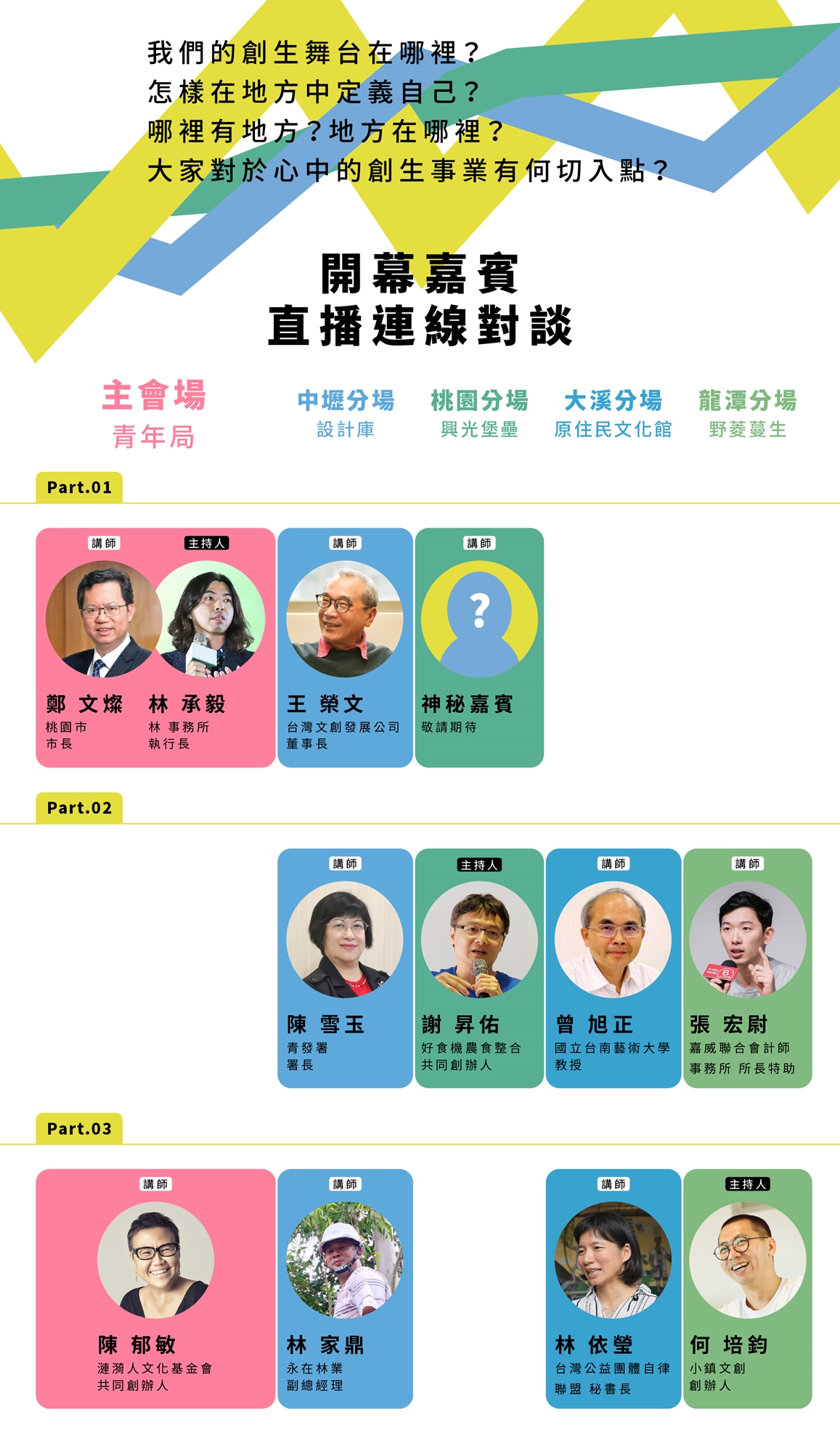 ⧉ 今年因應疫情發展,也首採「跨組分場」的創意模式,在桃園市政府青年事務局、桃園興光堡壘、桃園設計庫、大溪原住民族文化會館、龍潭野菱蔓生五個場地同時串連直播與實體舉行,創造在地真實體驗。