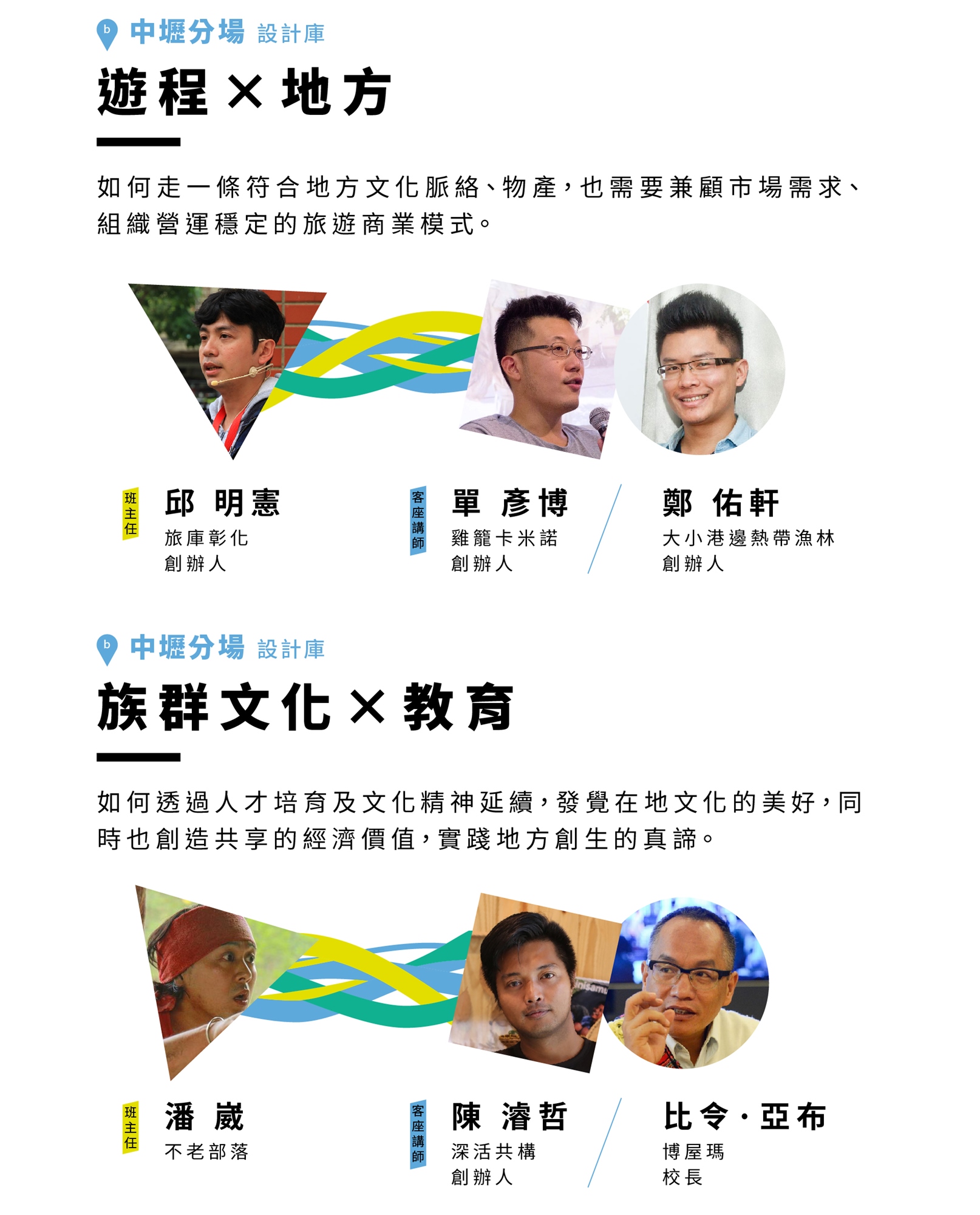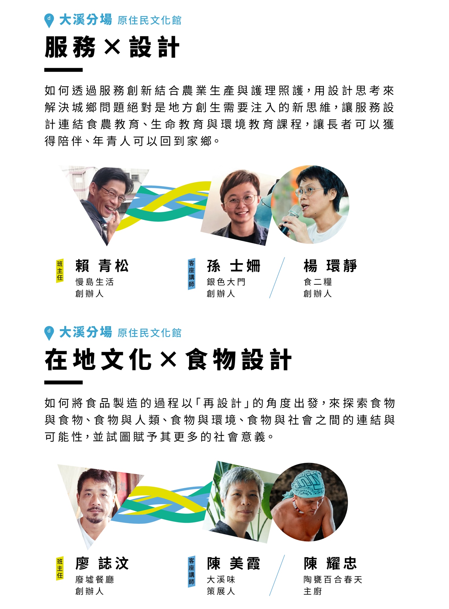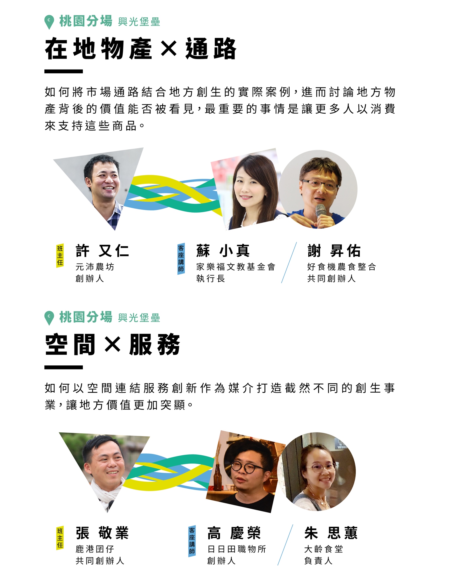 每個議題連結將邀請一位長期關注該領域的班主任以及二位地域實踐經驗豐富的前輩夥伴擔綱客座講師,透過創生經驗分享、QA對談與小組課堂練習,讓學員接觸豐富且深刻的經驗與思維,增進對地域活化的整體脈絡理解,並強化企劃實作能力,激盪地域前線新想像!