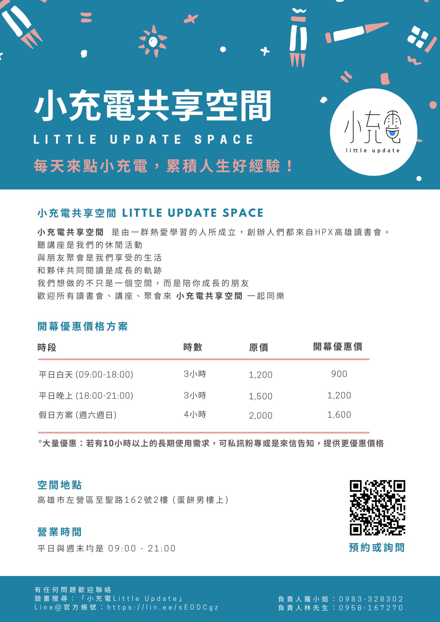 小充電共享空間 是由一群熱愛學習的人所成立,創辦人們都來自HPX高雄讀書會,聽講座是我們的休閒活動、與朋友聚會是我們享受的生活、和夥伴共同閱讀是成長的軌跡。
