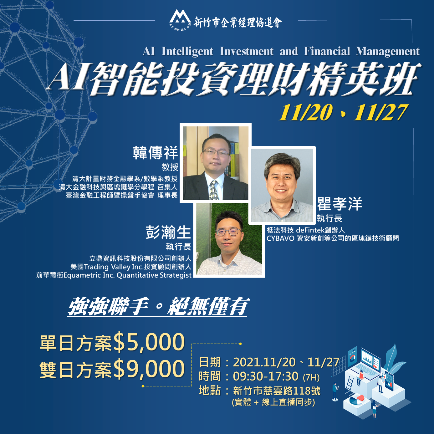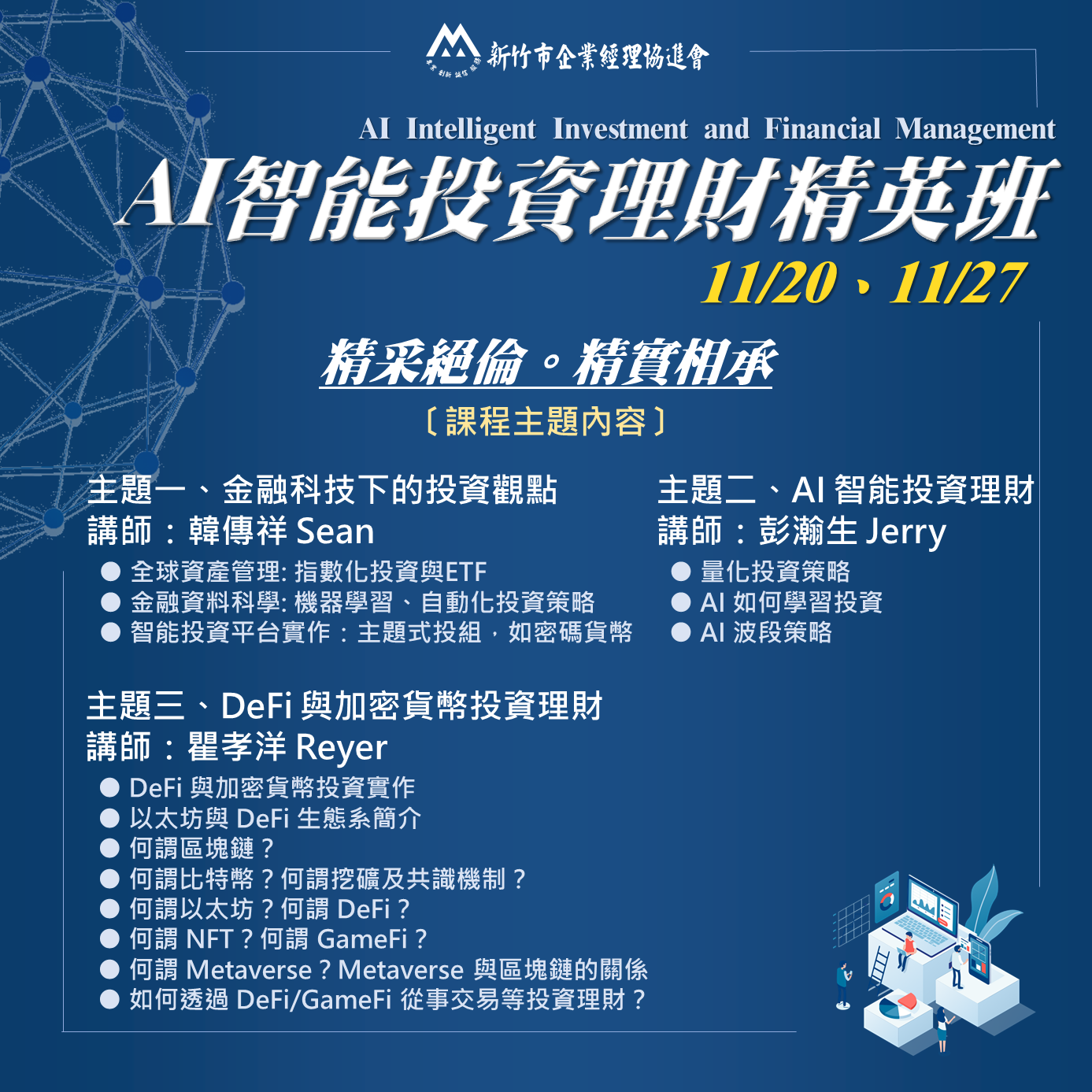 透過三大主題《金融科技下的投資觀點》、《AI 智能投資理財》、《DeFi 與加密貨幣投資理財》,搭配最實務的經驗分享,100%滿意破表!