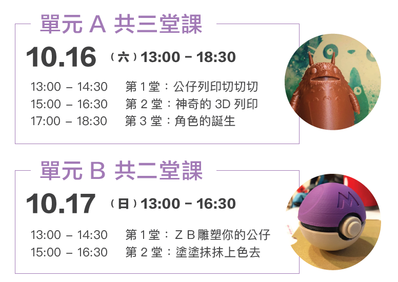 從2D轉化為3D的建構過程,透過一系列的工作坊課程安排,將想像力實踐話,設計角色從建模到上色等流程,體驗實踐IP角色設計,工作坊更安排3D列印的實作唷!