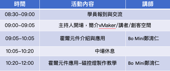 霍爾元件是一顆很有趣的小東西,例如它可以用來檢測出磁通密度,得到相對應的電流值、電壓值,此外也能偵測磁場的NS極,不同的磁極靠近,會有對應的輸出表現,而且磁極遠離後輸出仍可以保持最後的狀態,運用這樣的特色,讓霍爾元件不同於以往只是散熱功能,這次做出了簡易的磁控燈應用,Bo Mini老師將從基礎的霍爾元件原理介紹、實務應用,再到簡易磁控燈操作原理,手把手為各位為學員講解示範,除了能夠提供學員們使用霍爾元件的新想法外,亦能夠做跨領域的創新應用,打造出不同的作品。