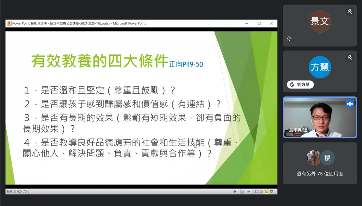 本次線上公益講座特別邀請 【親子教養溝通教練】張李明德老師,上半場帶領大家深入了解正向教養的內涵。
