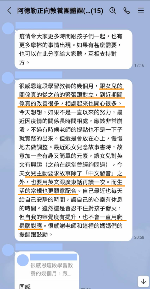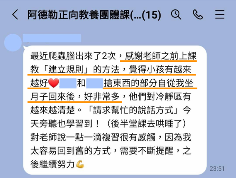 下半場開放爸媽們自由提問,可以詢問課堂上的觀念如何運用到生活,也可以詢問該如何改善你與孩子的互動,讓爸媽們真正將正向教養貫徹在親子互動中。