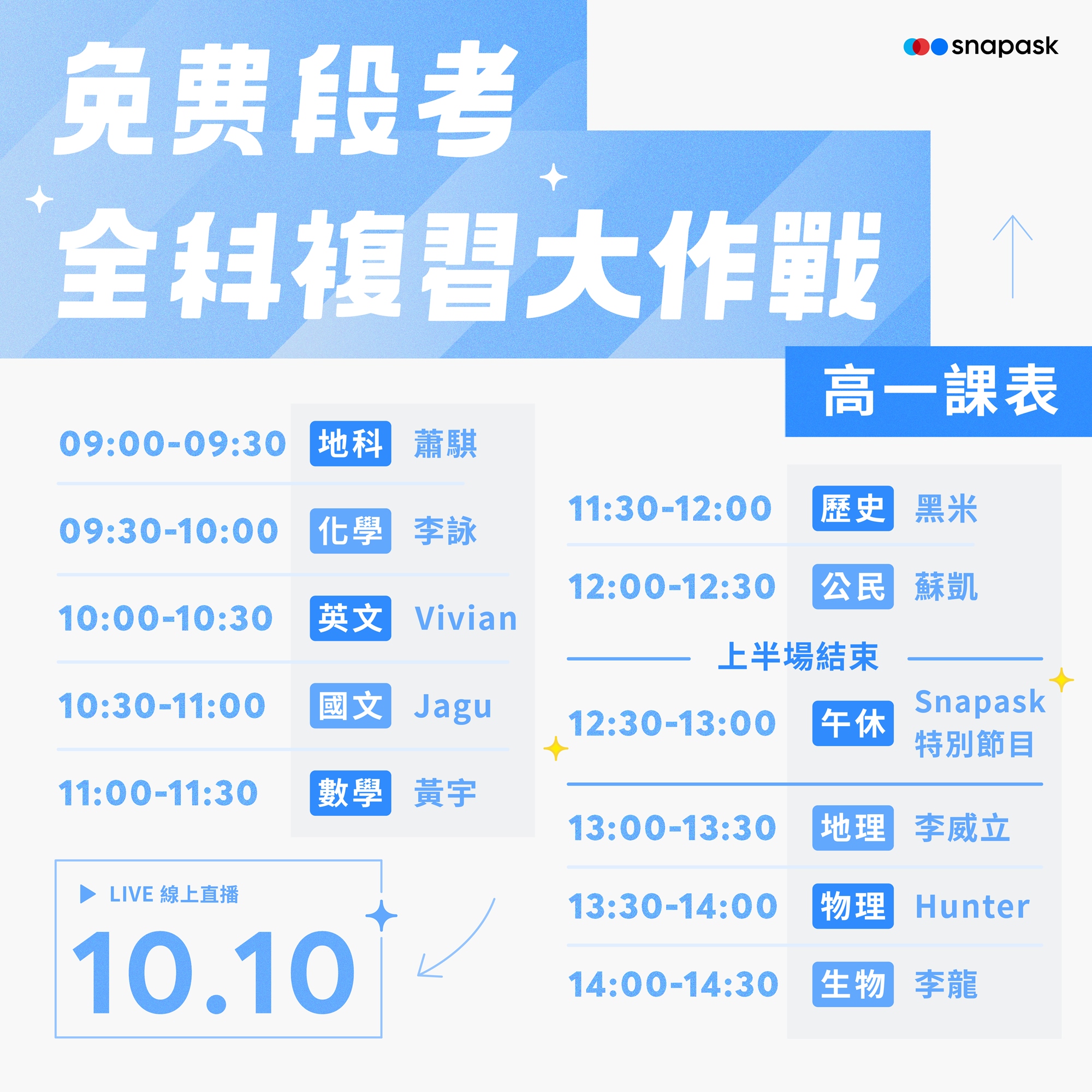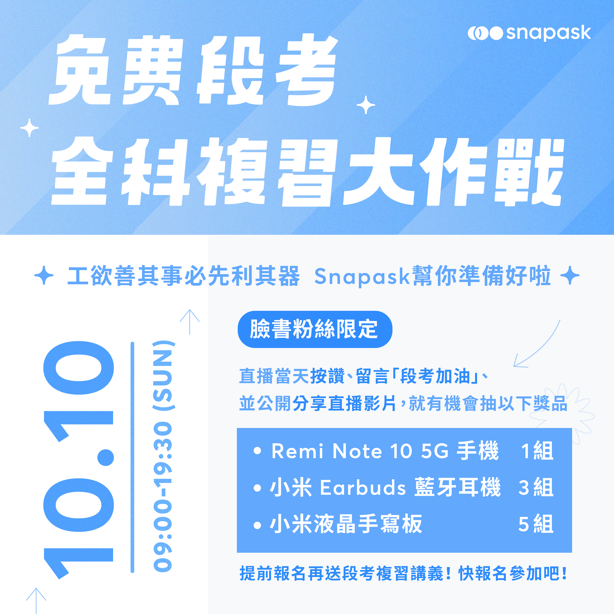 Snapask時課問是一個致力於幫助孩子解決課業問題的全方位線上學習平台,我們相信學習不只要紮實,更要高效率!因此,我們舉辦免費直播講座「考前必看!免費段考全科複習大作戰」請專業師資,帶同學用一天的時間複習完所有考前重點,為段考做好萬全準備。