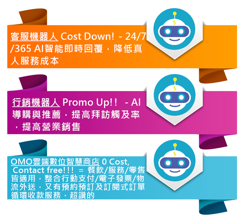 特別提供免費建置客服行銷機器人與OMO雲端數位智慧商店活動專案,協助企業與店家降低客服成本又能提高營收利潤,讓AI為企業與店家提供24/7/365全年不停休的服務~